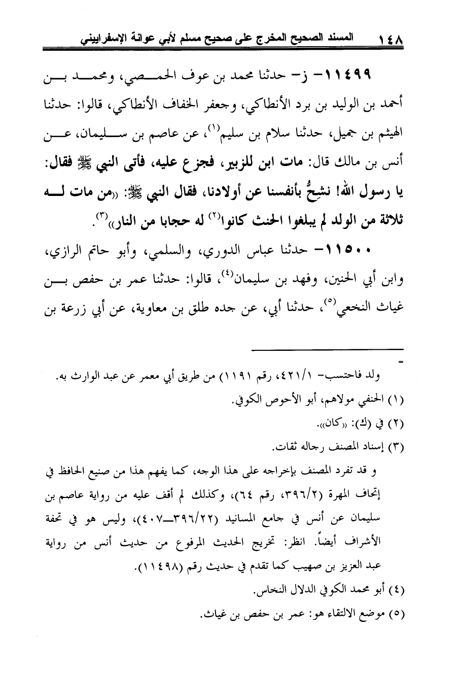 11499 - ز- حدثنا محمد بن عوف الحمصي، ومحمد بن أحمد بن الوليد بن برد الأنطاكي، وجعفر الخفاف الأنطاكي، قالوا: حدثنا الهيثم بن جميل، حدثنا سلام بن سليم (¬1)، عن عاصم بن سليمان، عن أنس بن مالك قال: مات ابن للزبير، فجزع عليه، فأتى النبي -صلى الله عليه وسلم- فقال: يا رسول الله! نشِحُّ بأنفسنا عن أولادنا، فقال النبي -صلى الله عليه وسلم-: "من مات له ثلاثة من الولد لم يبلغوا الحنث كانوا (¬2) له حجابًا من النار" (¬3).