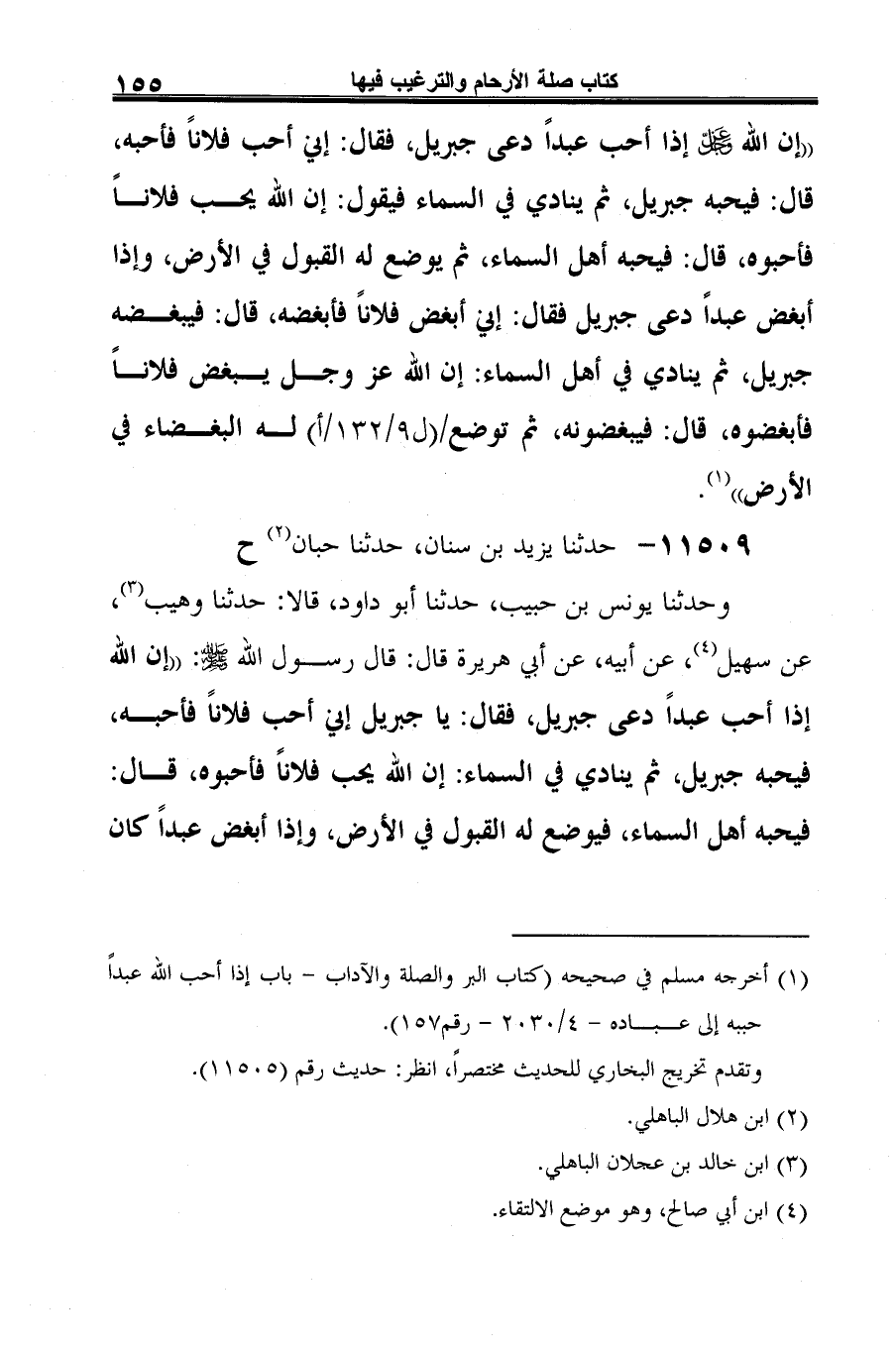وحدثنا يونس بن حبيب، حدثنا أبو داود، قالا: حدثنا وهيب (¬2)، عن سهيل (¬3)، عن أبيه، عن أبي هريرة قال: قال رسول الله -صلى الله عليه وسلم-: "إن الله إذا أحب عبدًا دعى جبريل، فقال: يا جبريل إني أحب فلانًا فأحبه، فيحبه جبريل، ثم ينادي في السماء: إن الله يحب فلانًا فأحبوه، قال: فيحبه أهل السماء، فيوضع له القبول في الأرض، وإذا أبغض عبدًا كان
