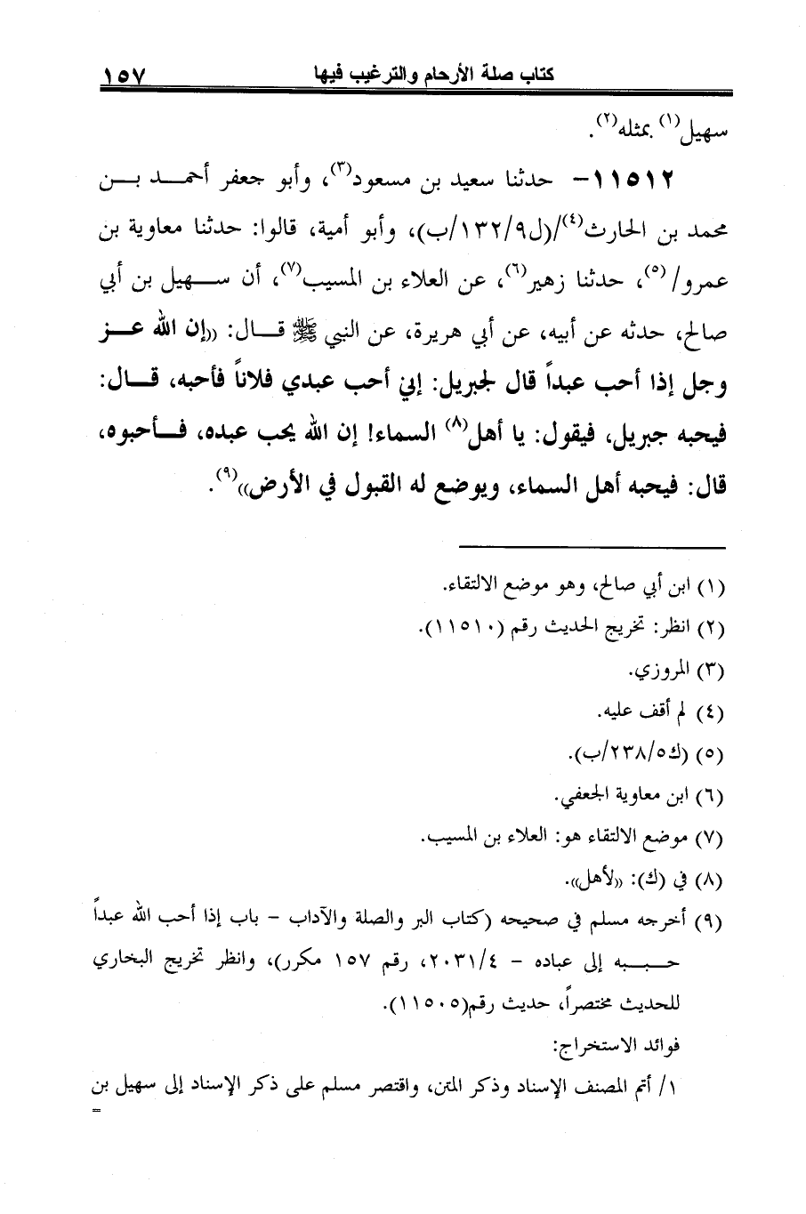 11512 - حدثنا سعيد بن مسعود (¬1)، وأبو جعفر أحمد بن محمد بن الحارث (¬2)، وأبو أمية، قالوا: حدثنا معاوية بن عمرو (¬3)، حدثنا زهير (¬4)، عن العلاء بن المسيب (¬5)، أن سهيل بن أبي صالح، حدثه عن أبيه، عن أبي هريرة، عن النبي -صلى الله عليه وسلم- قال: "إن الله عز وجل إذا أحب عبدًا قال لجبريل: إني أحب عبدي فلانًا فأحبه، قال: فيحبه جبريل، فيقول: يا أهل (¬6) السماء! إن الله يحب عبده، فأحبوه، قال: فيحبه أهل السماء، ويوضع له القبول في الأرض" (¬7).