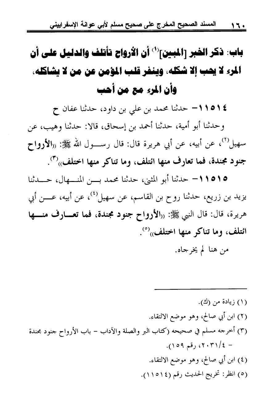 وحدثنا أبو أمية، حدثنا أحمد بن إسحاق، قالا: حدثنا وهيب، عن سهيل (¬1)، عن أبيه، عن أبي هريرة قال: قال رسول الله -صلى الله عليه وسلم-: "الأرواح جنود مجندة، فما تعارف منها ائتلف، وما تناكر منها اختلف" (¬2).