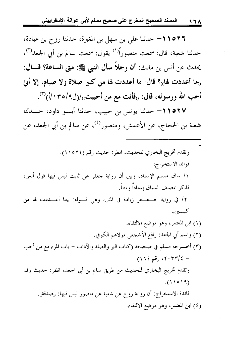 11526 - حدثنا علي بن سهل بن المغيرة، حدثنا روح بن عبادة، حدثنا شعبة، قال: سمعت منصورًا (¬1) يقول: سمعت سالم بن أبي الجعد (¬2)، يحدث عن أنس بن مالك: أن رجلًا سأل النبي -صلى الله عليه وسلم-: متى الساعة؟ قال: "ما أعددت لها"؟ قال: ما أعددت لها من كبير صلاة ولا صيام، إلا أني أحب الله ورسوله، قال: "فأنت مع من أحببت" (¬3).