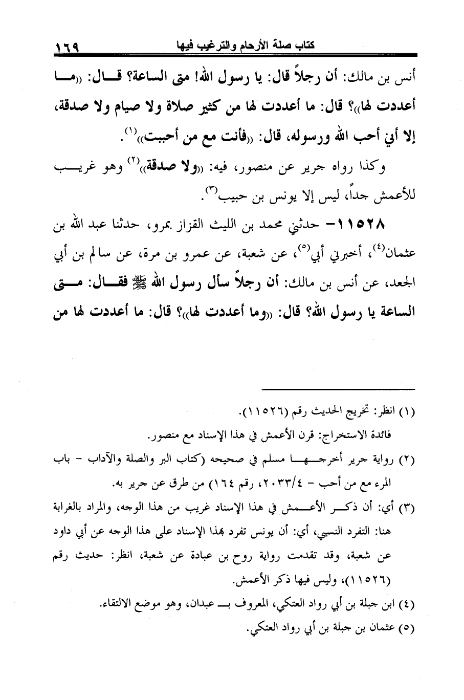 11528 - حدثني محمد بن الليث القزاز بمرو، حدثنا عبد الله بن عثمان (¬1)، أخبرني أبي (¬2)، عن شعبة، عن عمرو بن مرة، عن سالم بن أبي الجعد، عن أنس بن مالك: أن رجلًا سأل رسول الله -صلى الله عليه وسلم- فقال: متى الساعة يا رسول الله؟ قال: "وما أعددت لها"؟ قال: ما أعددت لها من