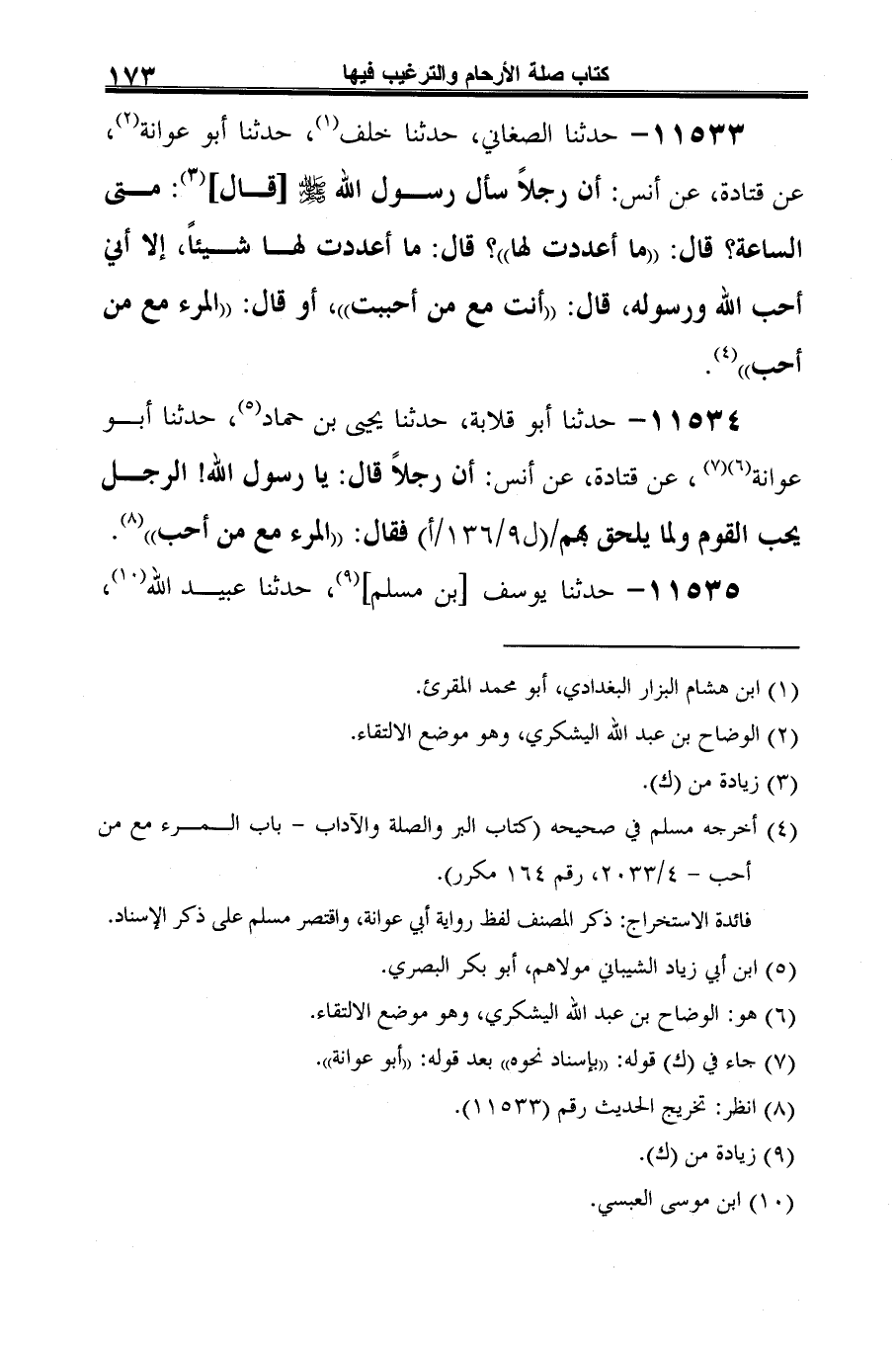 11534 - حدّثنا أبو قلابة، حدّثنا يحيى بن حماد (¬1)، حدّثنا أبو عوانة (¬2) (¬3)، عن قتادة، عن أنس: أن رجلًا قال: يا رسول الله! الرَّجل يحب القوم ولا يلحق بهم فقال: "المرء مع من أحب" (¬4).