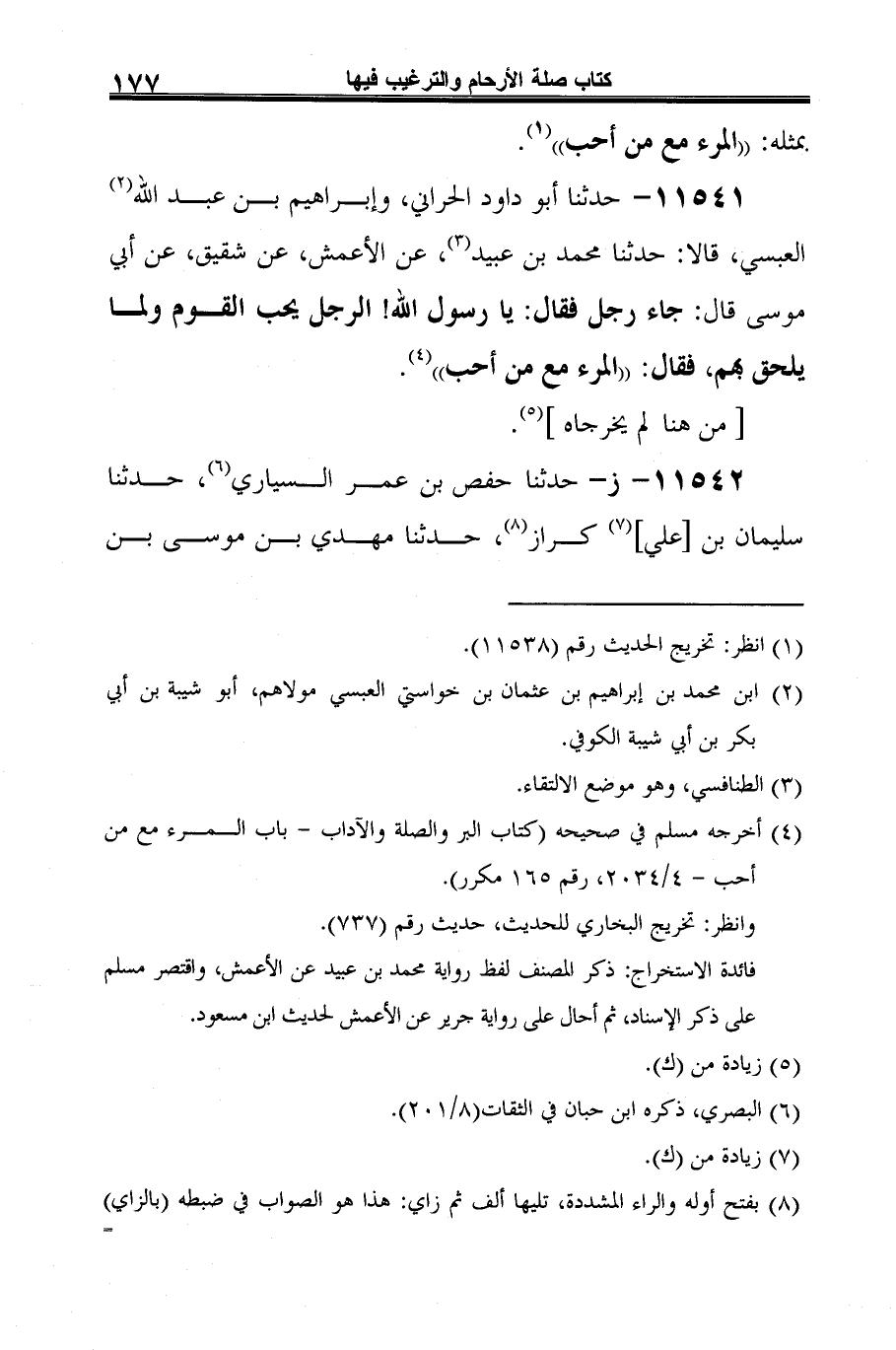 11541 - حدّثنا أبو داود الحراني، وإبراهيم بن عبد الله (¬1) العبسي، قالا: حدّثنا محمّد بن عبيد (¬2)، عن الأعمش، عن شقيق، عن أبي موسى قال: جاء رجل فقال: يا رسول الله! الرَّجل يحب القوم ولما يلحق بهم، فقال: "المرء مع من أحب" (¬3).