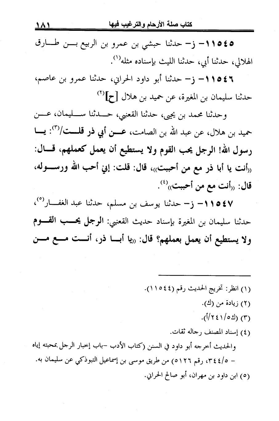 11547 - ز- حدّثنا يوسف بن مسلم، حدّثنا عبد الغفار (¬1)، حدّثنا سليمان بن المغيرة بإسناد حديث القعنبي: الرَّجل يحب القوم ولا يستطيع أن يعمل بعملهم؟ قال: "يا أبا ذر، أنت مع من