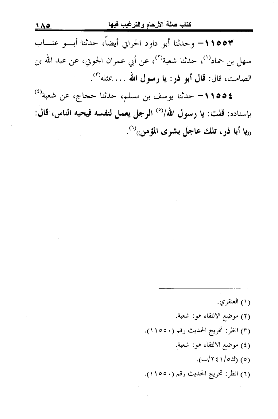 11553 - وحدثنا أبو داود الحراني أيضًا، حدثنا أبو عتاب سهل بن حماد (¬1)، حدثنا شعبة (¬2)، عن أبي عمران الجوني، عن عبد الله بن الصامت، قال: قال أبو ذر: يا رسول الله .... بمثله (¬3).