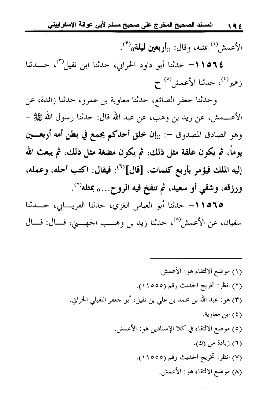 وحدثنا جعفر الصائع، حدّثنا معاوية بن عمرو، حدّثنا زائدة، عن الأعمش، عن زيد بن وهب، عن عبد الله قال: حدّثنا رسول الله -صلى الله عليه وسلم-وهو الصادق المصدوق-: "إن خلق أحدكم يجمع في بطن أمه أربعين يومًا، ثمّ يكون علقة مثل ذلك، ثمّ يكون مضغة مثل ذلك، ثمّ يبعث الله إليه الملك فيؤمر بأربع كلمات، [قال] (¬4): فيقال: اكتب أجله، وعمله، ورزقه، وشقي أو سعيد، ثمّ تنفخ فيه الرُّوح ... " بمثله (¬5).