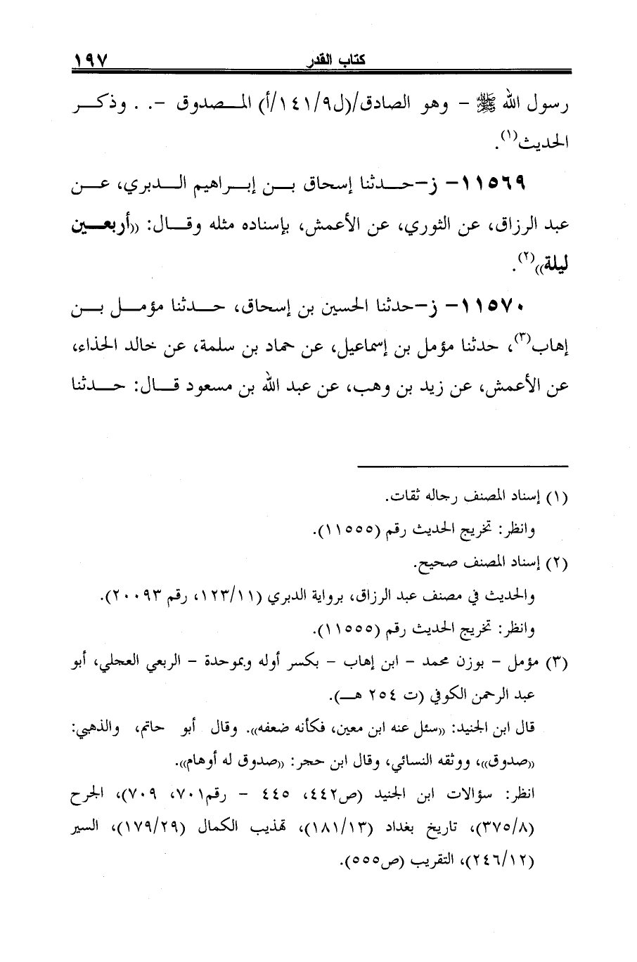 11569 - ز- حدّثنا إسحاق بن إبراهيم الدبري، عن عبد الرزّاق، عن الثّوريّ، عن الأعمش، بإسناده مثله وقال: "أربعين ليلة" (¬1).