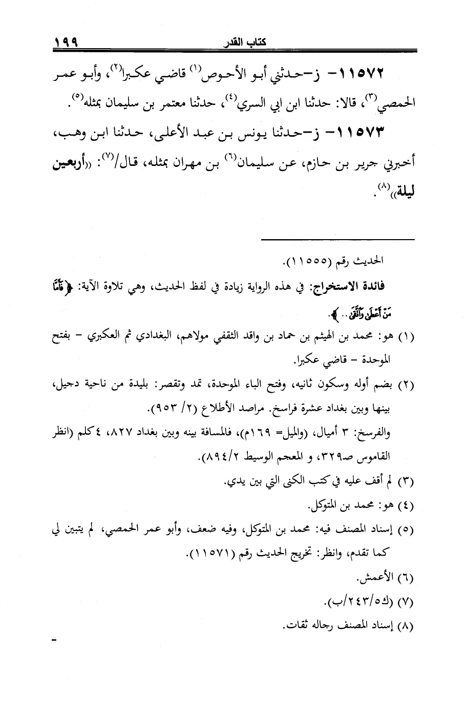 11572 - ز- حدثني أبو الأحوص (¬1) قاضي عكبرا (¬2)، وأبو عمر الحمصي (¬3)، قالا: حدّثنا ابن أبي السري (¬4)، حدّثنا معتمر بن سليمان بمثله (¬5).