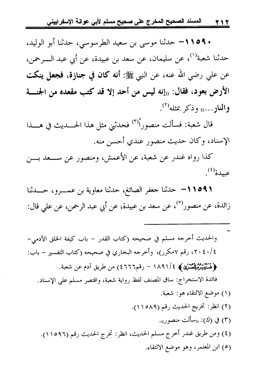 11590 - حدّثنا موسى بن سعيد الطرسوسي، حدّثنا أبو الوليد، حدّثنا شعبة (¬1)، عن سليمان، عن سعد بن عبيدة، عن أبي عبد الرحمن، عن علي رضي الله عنه، عن النبي -صلى الله عليه وسلم-: أنه كان في جنازة، فجعل ينكت الأرض بعود، فقال: "إنّه ليس من أحد إِلَّا قد كتب مقعده من الجنَّة والنار ... " وذكر بمثله (¬2).