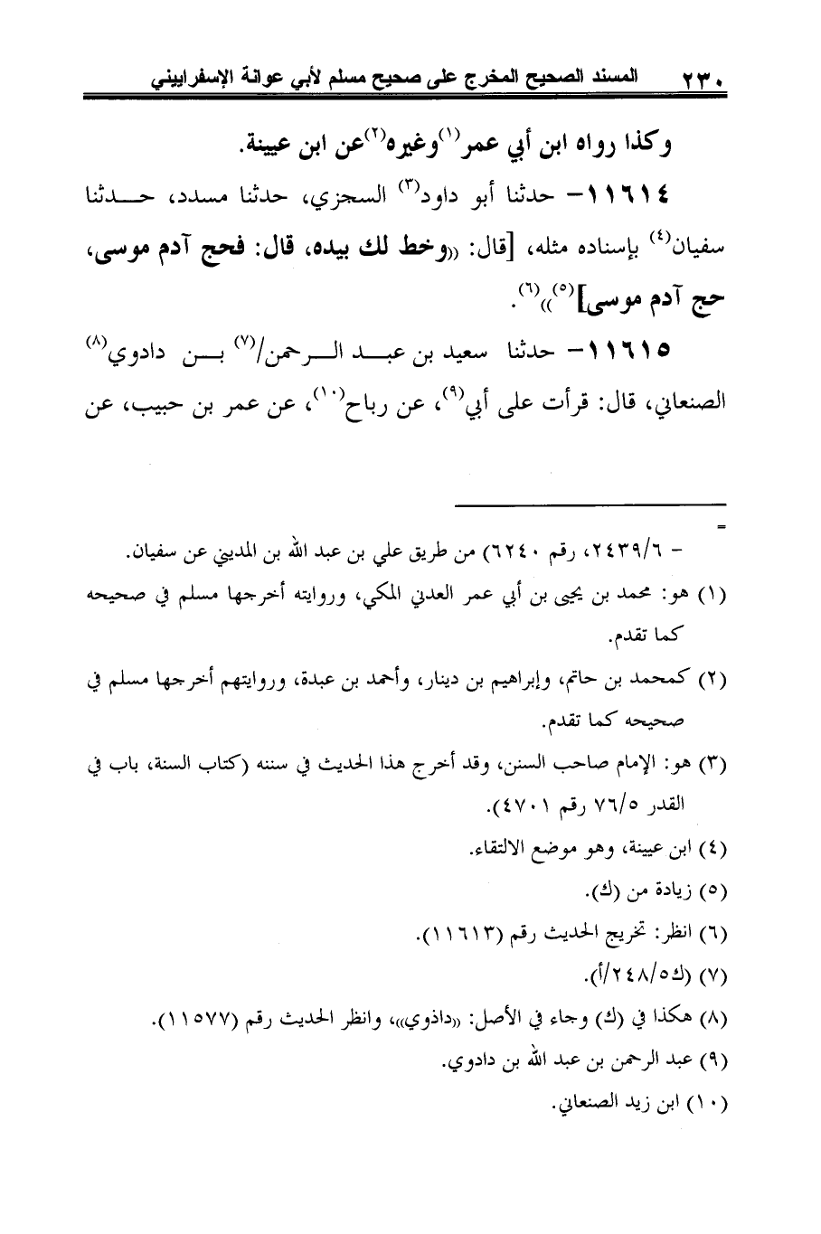 11614 - حدثنا أَبو داود (¬1) السجزي، حدثنا مسدد، حدثنا سفيان (¬2) بإسناده مثله، [قال: "وخط لك بيده، قال: فحج آدم موسى، حج آدم موسى] (¬3) " (¬4).