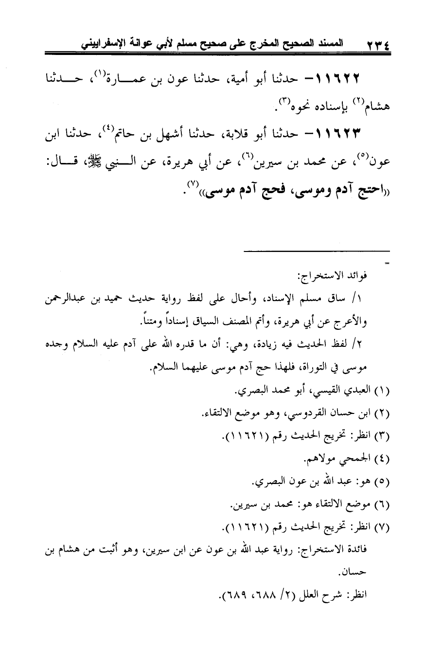 11623 - حدثنا أَبو قلابة، حدثنا أشهل بن حاتم (¬1)، حدثنا ابن عون (¬2)، عن محمد بن سيرين (¬3)، عن أبي هريرة، عن النبي -صلى الله عليه وسلم-، قال: "احتج آدم وموسى، فحج آدم موسى" (¬4).