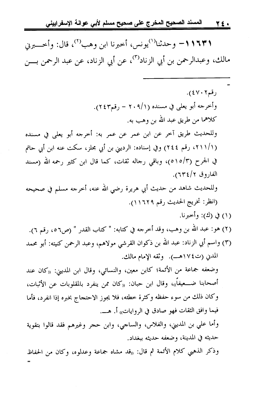 11631 - وحدثنا (¬1) يونس، أخبرنا ابن وهب (¬2)، قال: وأخبرني مالك، وعبد الرحمن بن أبي الزناد (¬3)، عن أبي الزناد، عن عبد الرحمن بن
