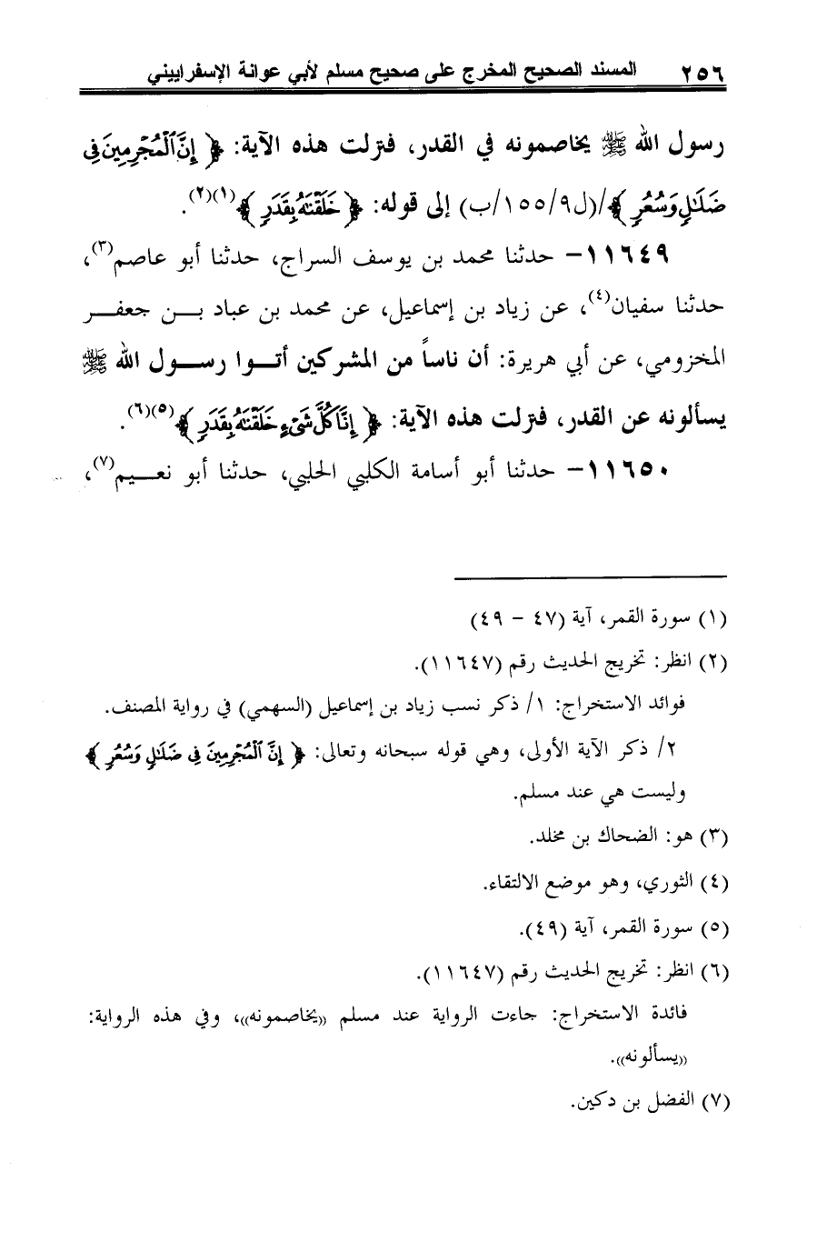 11649 - حدثنا محمد بن يوسف السراج، حدثنا أَبو عاصم (¬1)، حدثنا سفيان (¬2)، عن زياد بن إسماعيل، عن محمد بن عباد بن جعفر المخزومي، عن أبي هريرة: أن ناسًا من المشركين أتوا رسول الله -صلى الله عليه وسلم- يسألونه عن القدر، فنزلت هذه الآية: {إِنَّا كُلَّ شَيْءٍ خَلَقْنَاهُ بِقَدَرٍ} (¬3) (¬4).
