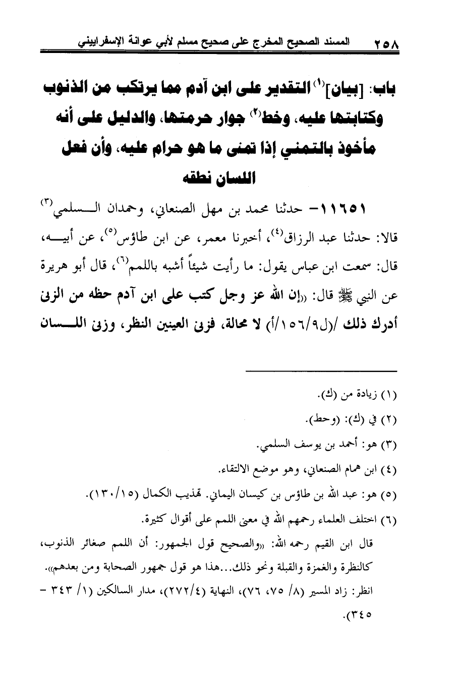 (¬6) أخرجه مسلم في تصحيحه (كتاب القدر -باب قدر على ابن آدم حظه من الزنى وغيره-4/ 2046 - رقم: 20).