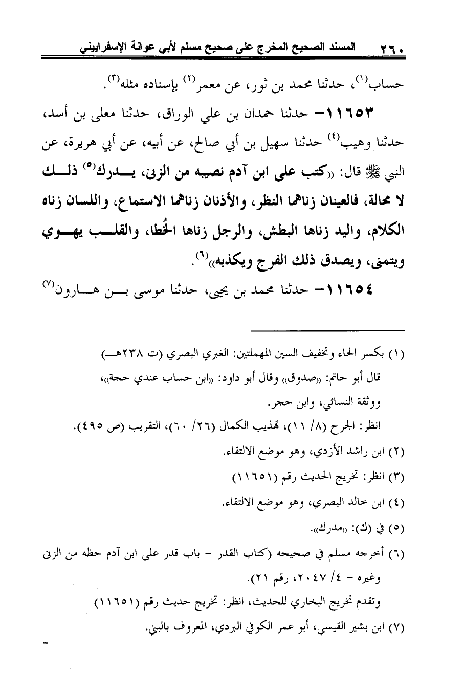 11653 - حدثنا حمدان بن علي الوراق، حدثنا معلى بن أسد، حدثنا وهيب (¬1) حدثنا سهيل بن أبي صالح، عن أبيه، عن أبي هريرة، عن النبي -صلى الله عليه وسلم- قال: "كتب على ابن آدم نصيبه من الزنى، يدرك (¬2) ذلك لا محالة، فالعينان زناها النظر، والأذنان زناهما الاستماع، واللسان زناه الكلام، واليد زناها البطش، والرجل زناها الخُطا، والقلب يهوي ويتمنى، ويصدق ذلك الفرج ويكذبه" (¬3).