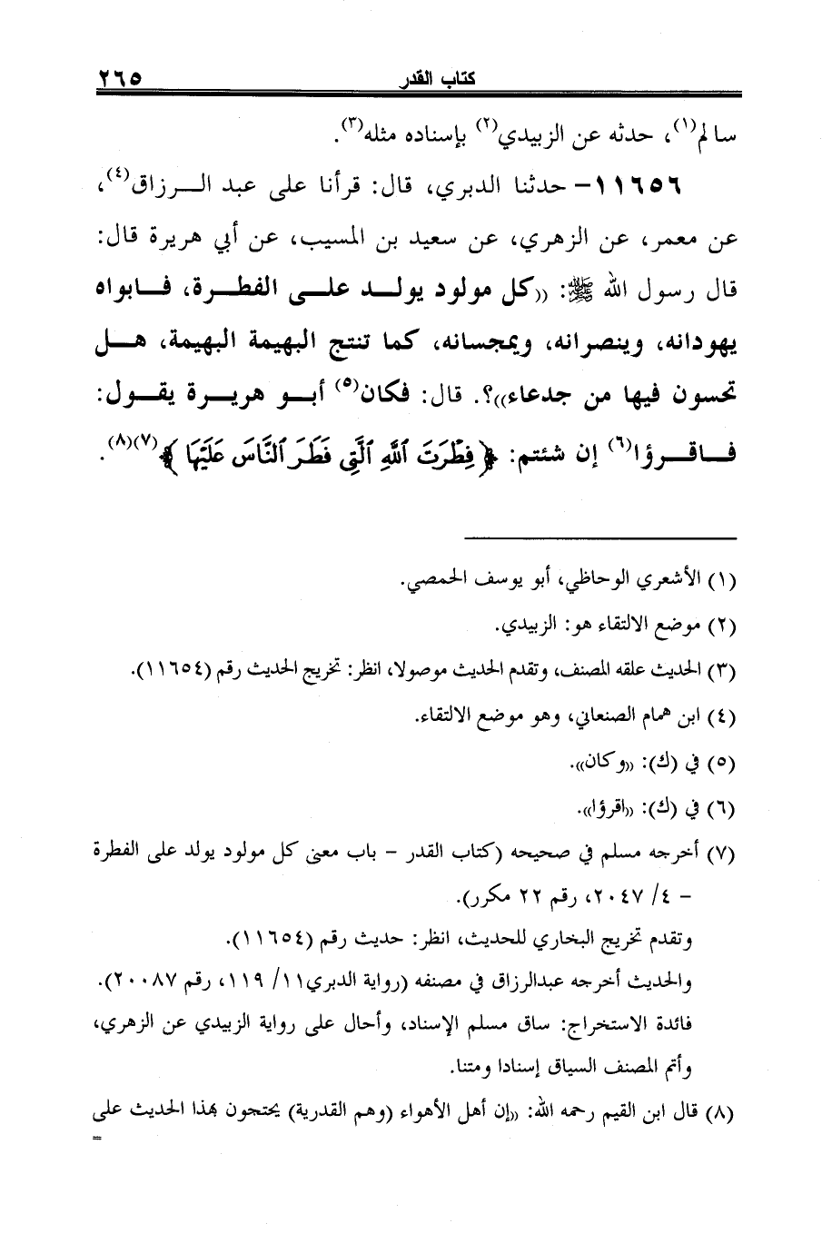 11656 - حدثنا الدبري، قال: قرأنا على عبد الرزاق (¬1)، عن معمر، عن الزهري، عن سعيد بن المسيب، عن أبي هريرة قال: قال رسول الله -صلى الله عليه وسلم-: "كل مولود يولد على الفطرة، فأبواه يهودانه، وينصرانه، ويمجسانه، كما تنتج البهيمة البهيمة، هل تحسون فيها من جدعاء"؟. قال: فكان (¬2) أَبو هريرة يقول: فاقرؤا (¬3) إن شئتم: {فِطْرَتَ اللَّهِ الَّتِي فَطَرَ النَّاسَ عَلَيْهَا} (¬4) (¬5).