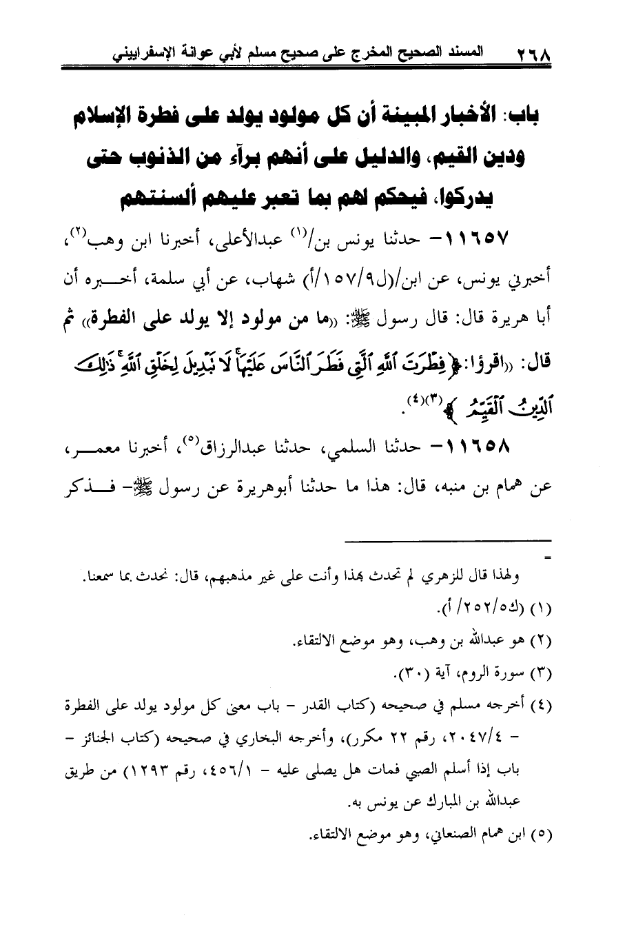(¬4) أخرجه مسلم في صحيحه (كتاب القدر -باب معنى كل مولود يولد على الفطرة - 4/ 2047، رقم 22 مكرر)، وأخرجه البخاري في صحيحه (كتاب الجنائز- باب إذا أسلم الصبي فمات هل يصلى عليه-1/ 456، رقم 1293) من طريق عبد الله بن المبارك عن يونس به.