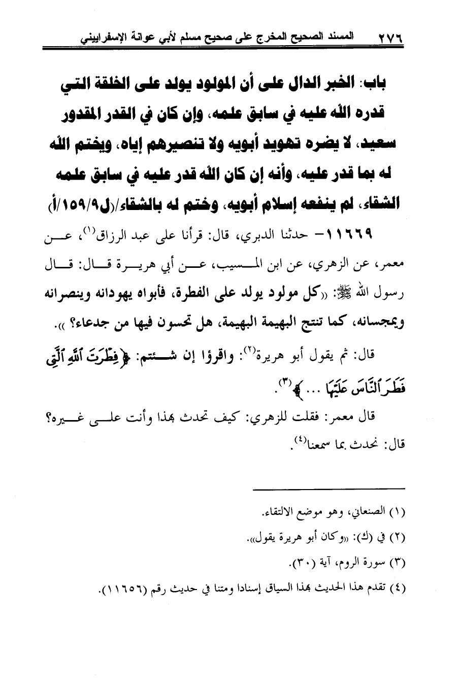 11669 - حدثنا الدبري، قال: قرأنا على عبد الرزاق (¬1)، عن معمر، عن الزهري، عن ابن المسيب، عن أبي هريرة قال: قال رسول الله -صلى الله عليه وسلم-: "كل مولود يولد على الفطرة، فأبواه يهودانه وينصرانه ويمجسانه، كما تنتج البهيمة البهيمة، هل تحسون فيها من جدعاء؟ ".