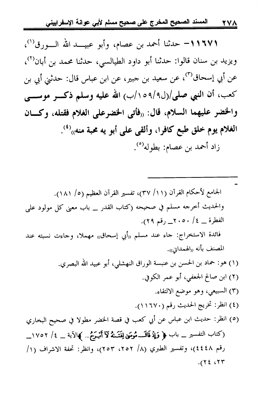 11671 - حدثنا أحمد بن عصام، وأبو عبيد الله الورق (¬1)، ويزيد بن سنان قالوا: حدثنا أبو داود الطيالسي، حدثنا محمد بن أبان (¬2)، عن أبي إسحاق (¬3)، عن سعيد بن جبير، عن ابن عباس قال: حدثني أبي بن كعب، أن النبي صلى الله عليه وسلم ذكر موسى والحضر عليهما السلام، قال: "فأتى الحضر على الغلام فقتله، وكان الغلام يوم خلق طبع كافرًا، وألقى على أبويه محبة منه" (¬4).