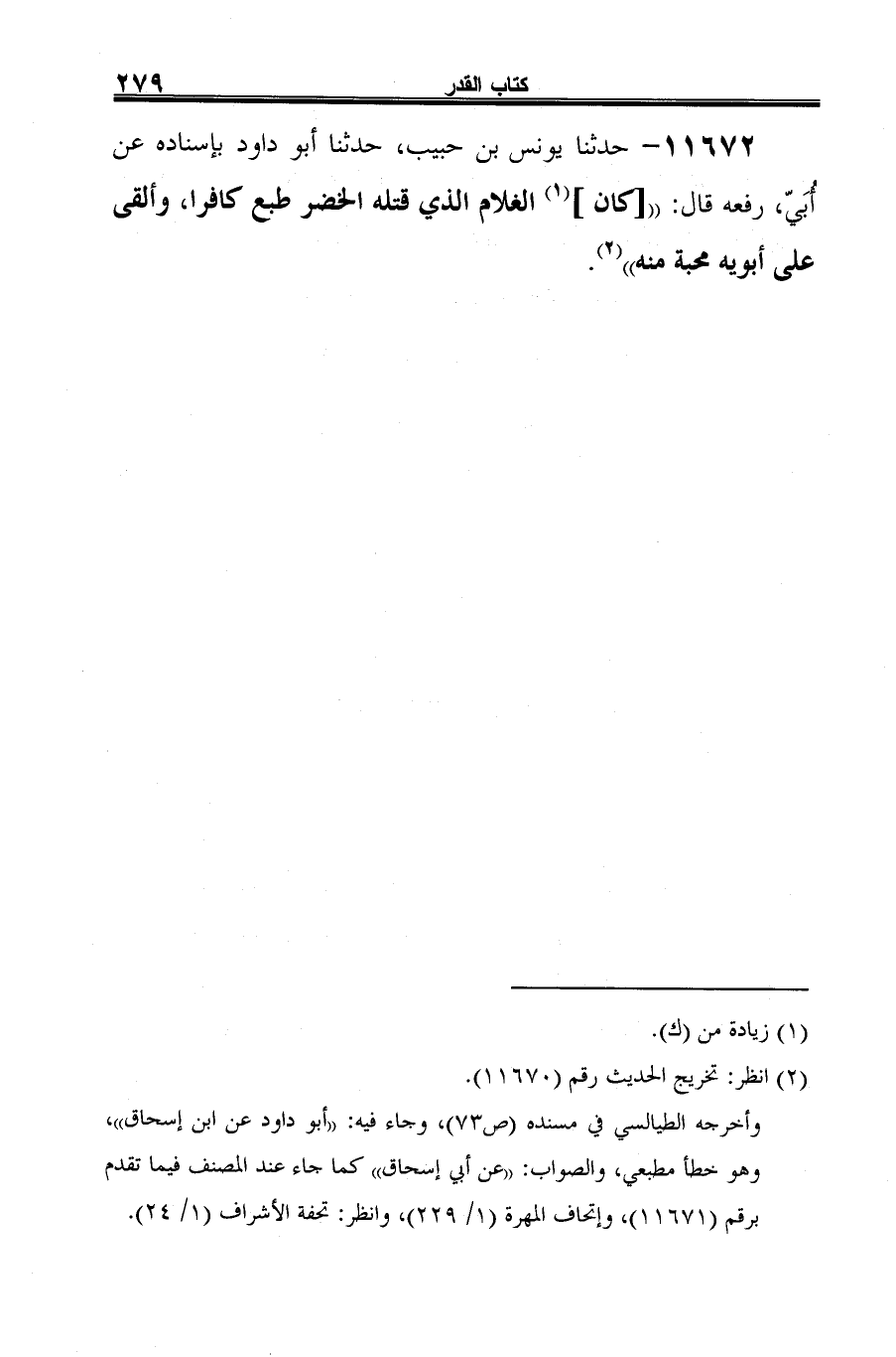 11672 - حدثنا يونس بن حبيب، حدثنا أبو داود بإسناده عن أُبَيّ، رفعه قال: " [كان] (¬1) الغلام الذي قتله الخضر طبع كافرًا، وألقى على أبويه محبة منه" (¬2).