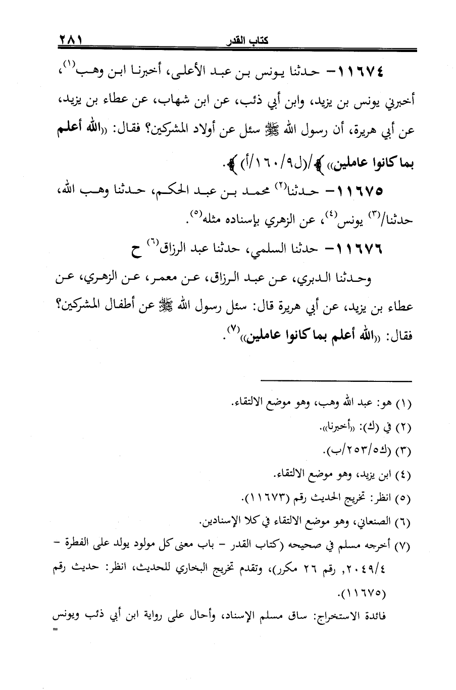 11674 - حدثنا يونس بن عبد الأعلى، أخبرنا ابن وهب (¬1)، أخبرني يونس بن يزيد، وابن أبي ذئب، عن ابن شهاب، عن عطاء بن يزيد، عن أبي هريرة، أن رسول الله -صلى الله عليه وسلم- سئل عن أولاد المشركين؟ فقال: "الله أعلم بما كانوا عاملين".