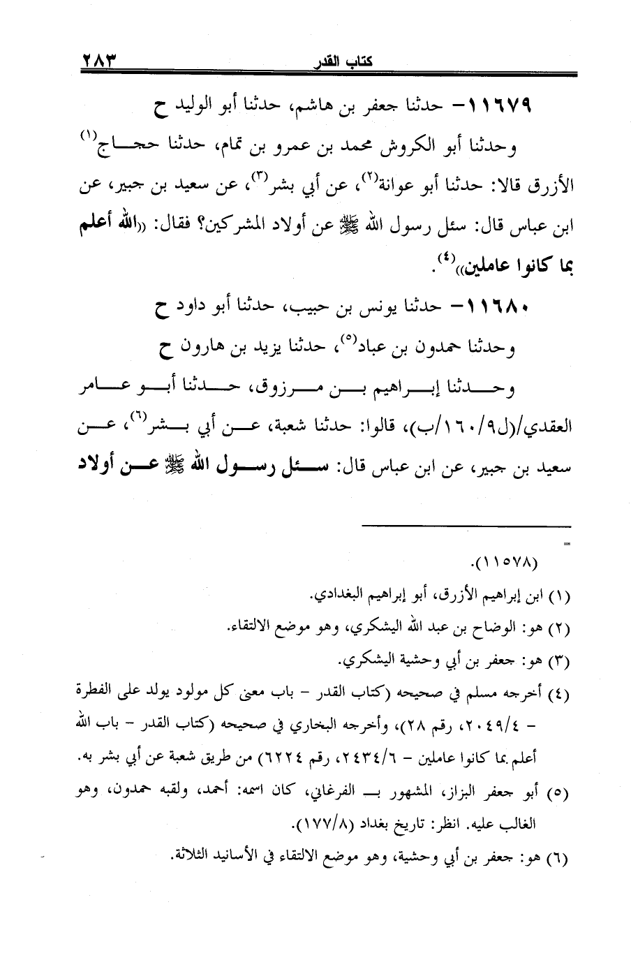 (¬4) أخرجه مسلم في صحيحه (كتاب القدر -باب معنى كل مولود يولد على الفطرة -4/ 2049، رقم 28)، وأخرجه البخاري في صحيحه (كتاب القدر -باب الله أعلم بما كانوا عاملين- 6/ 2434، رقم 6224) من طريق شعبة عن أبي بشر به.
