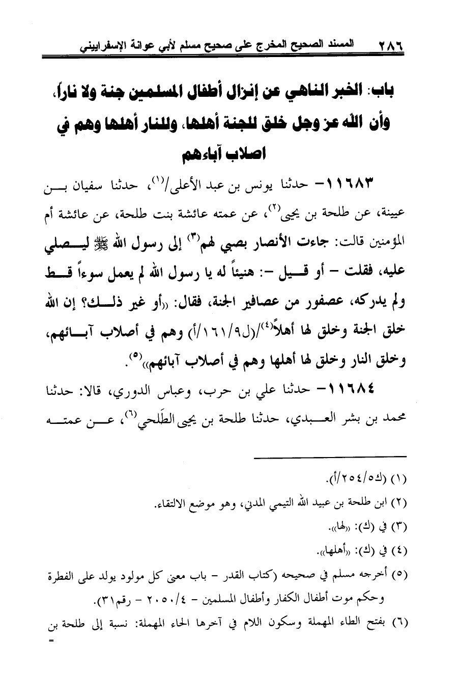 (¬5) أخرجه مسلم في صحيحه (كتاب القدر -باب معنى كل مولود يولد على الفطرة وحكم موت أطفال الكفار وأطفال المسلمين-4/ 2050 - رقم 31).