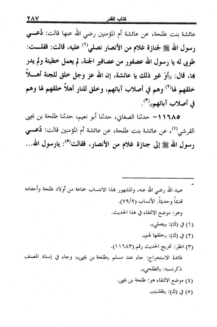 11685 - حدثنا الصغاني، حدثنا أبو نعيم، حدثنا طلحة بن يحيى القرشي (¬1)، عن عائشة بنت طلحة، عن عائشة أم المؤمنين قالت: دُعي رسول الله -صلى الله عليه وسلم- إلى جنازة غلام من الأنصار، فقالت (¬2): يا رسول الله ...