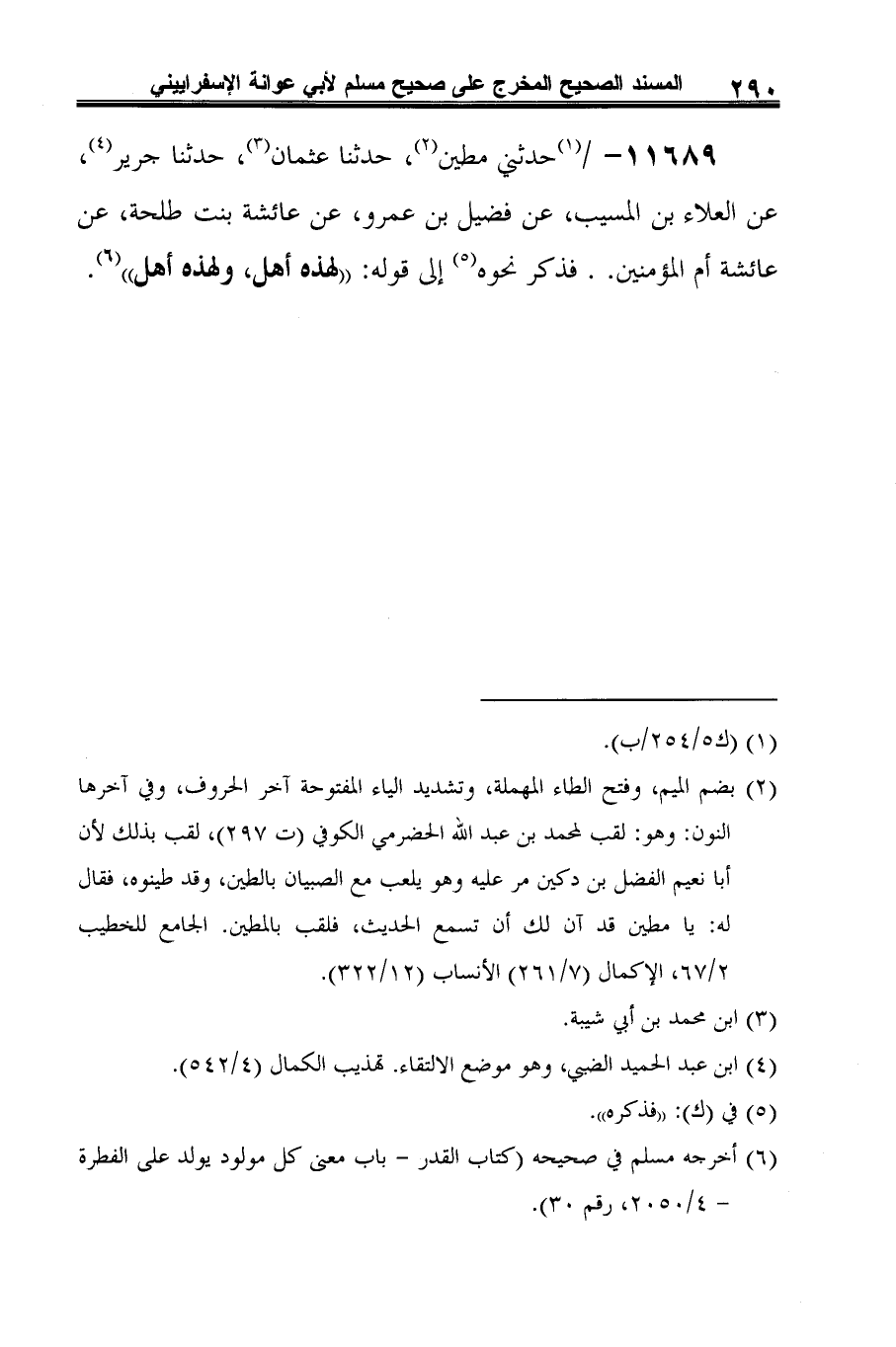 11689 - (¬1) حدثني مطين (¬2)، حدثنا عثمان (¬3)، حدثنا جرير (¬4)، عن العلاء بن المسيب، عن فضيل بن عمرو، عن عائشة بنت طلحة، عن عائشة أم المؤمنين .. فذكر نحوه (¬5) إلى قوله: "لهذه أهل، ولهذه أهل" (¬6).