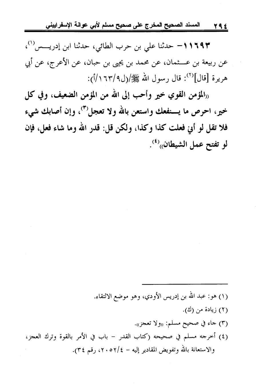 (¬4) أخرجه مسلم في صحيحه (كتاب القدر -باب في الأمر بالقوة وترك العجز، والاستعانة بالله وتفويض المقادير إليه-4/ 2052، رقم 34).