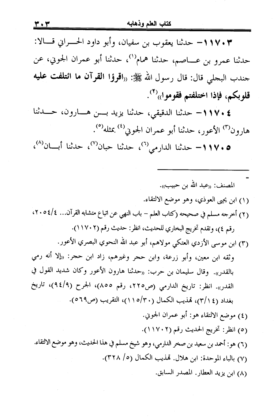 -[304]- حدثنا أبو عمران قال: قال لنا جندب ونحن غلمان بالكوفة: قال رسول الله -صلى الله عليه وسلم-: "اقرؤا القرآن ما ائتلفت عليه قلوبكم، فإذا اختلفتم فقوموا" (¬4).
