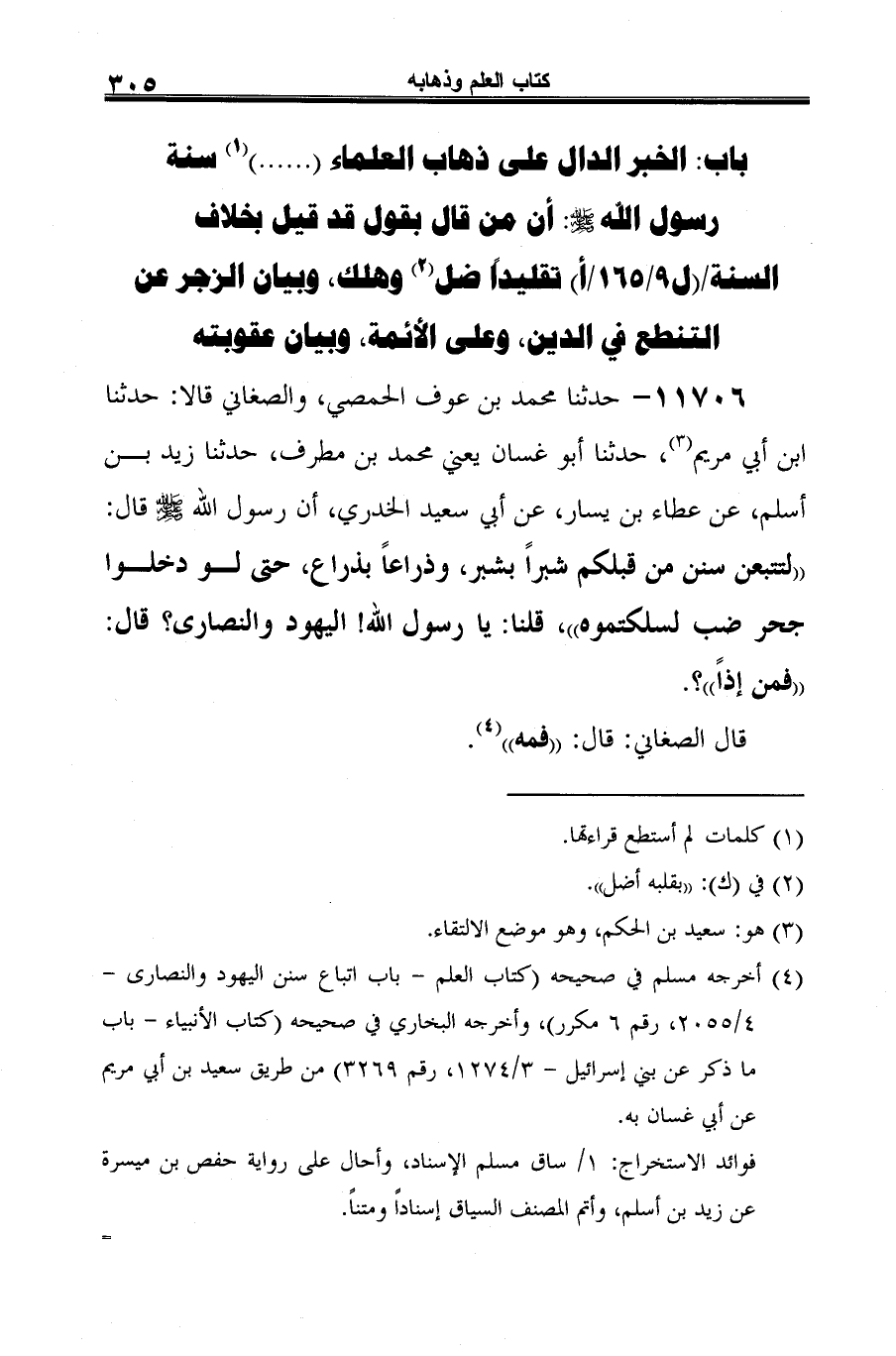 11706 - حدثنا محمد بن عوف الحمصي، والصغاني قالا: حدثنا ابن أبي مريم (¬1)، حدثنا أبو غسان يعني محمد بن مطرف، حدثنا زيد بن أسلم، عن عطاء بن يسار، عن أبي سعيد الخدري، أن رسول الله -صلى الله عليه وسلم- قال: "لتتبعن سنن من قبلكم شبرًا بشبر، وذراعًا بذراع، حتى لو دخلوا جحر ضب لسلكتموه"، قلنا: يا رسول الله! اليهود والنصارى؟ قال: "فمن إذًا"؟.
