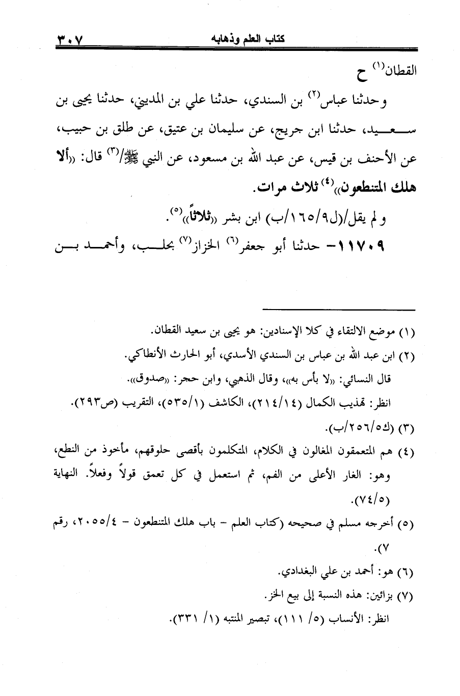 وقال ابن ملاعب: حدثنا -أظنه- ابن أبي شيبة (¬4)، حدثنا حفص [بن غياث] (¬5)، عن ابن جريج، عن سليمان بن عتيق، عن طلق بن حبيب، عن الأحنف بن قيس، عن عبد الله بن مسعود قال: قلت لصاحب لي: تعال حتى لا نكلم اليوم أحدًا، فمر بنا رسول الله -صلى الله عليه وسلم- فلم نرد عليه، فقال رسول الله -صلى الله عليه وسلم-: "ألا هلك المتنطعون -ثلاثًا-" (¬6).
