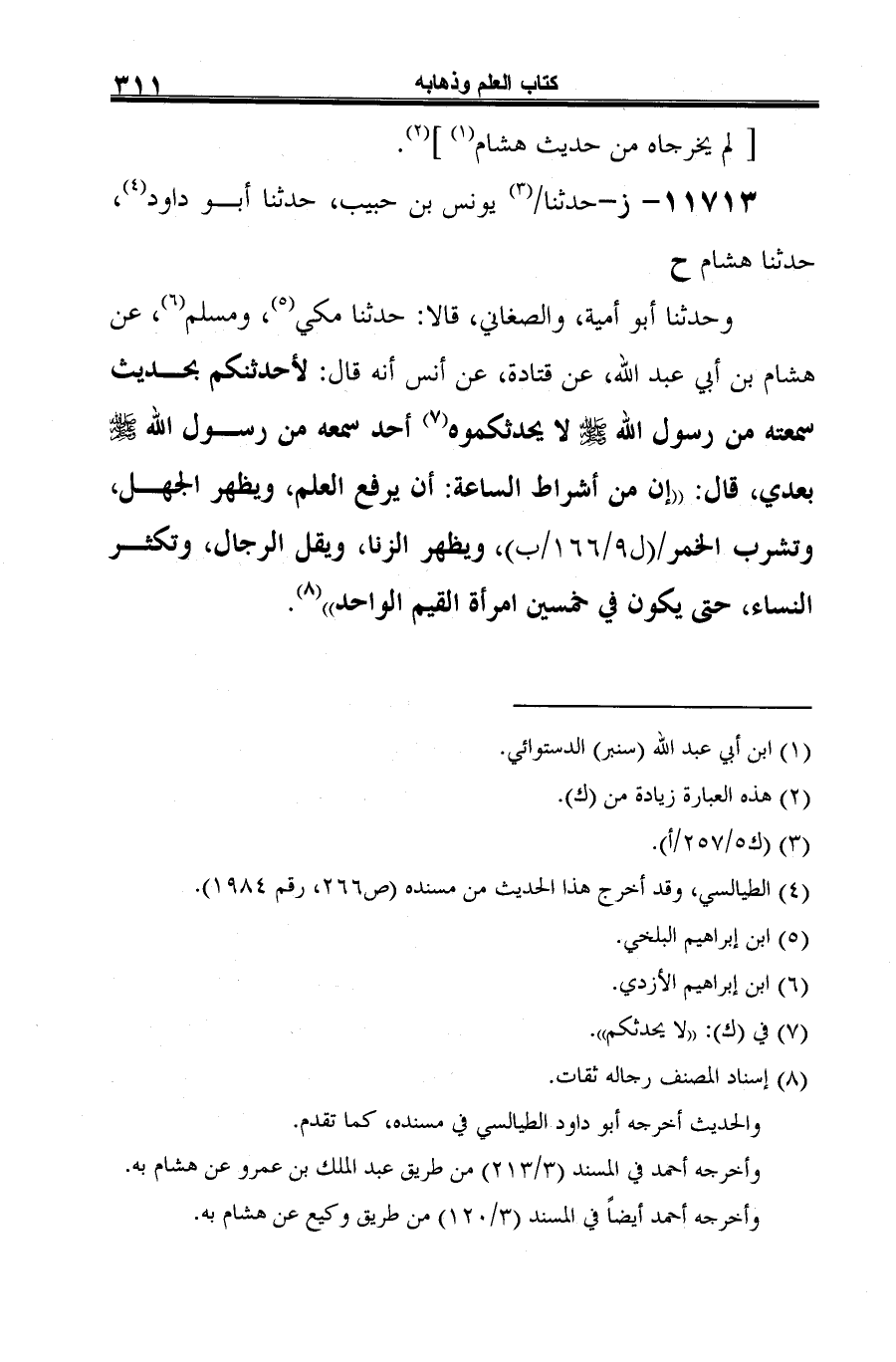 وحدثنا أبو أمية، والصغاني، قالا: حدثنا مكي (¬3)، ومسلم (¬4)، عن هشام بن أبي عبد الله، عن قتادة، عن أنس أنه قال: لأحدثنكم بحديث سمعته من رسول الله -صلى الله عليه وسلم- لا يحدثكموه (¬5) أحد سمعه من رسول الله -صلى الله عليه وسلم- بعدي، قال: "إن من أشراط الساعة: أن يرفع العلم، ويظهر الجهل، وتشرب الخمر، ويظهر الزنا، ويقل الرجال، وتكثر النساء، حتى يكون في خمسين امرأة القيم الواحد" (¬6).