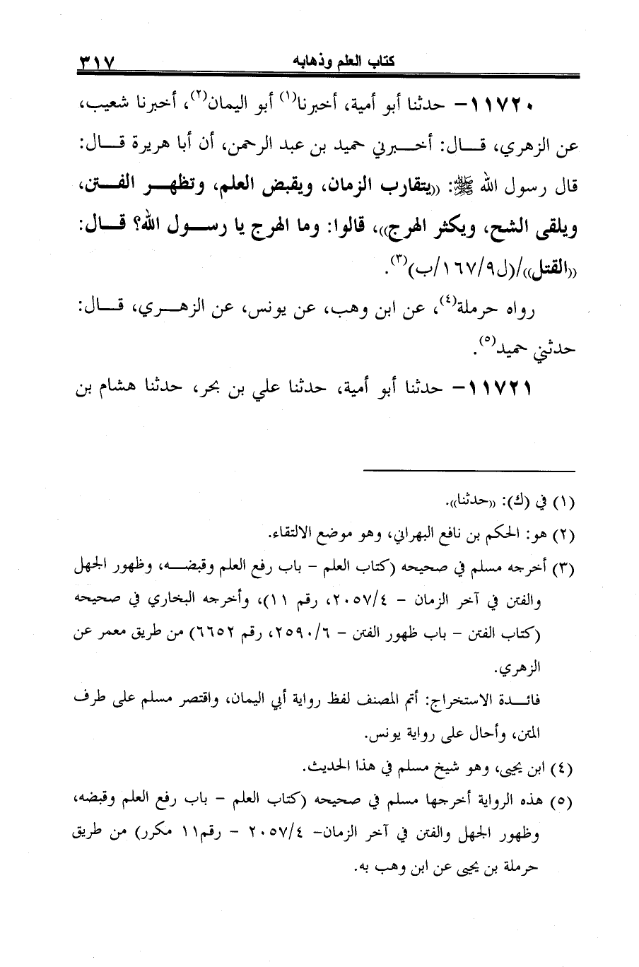 (¬5) هذه الرواية أخرجها مسلم في صحيحه (كتاب العلم -باب رفع العلم وقبضه، وظهور الجهل والفتن في آخر الزمان- 4/ 2057 - رقم 11 مكرر) من طريق حرملة بن يحيى عن ابن وهب به.