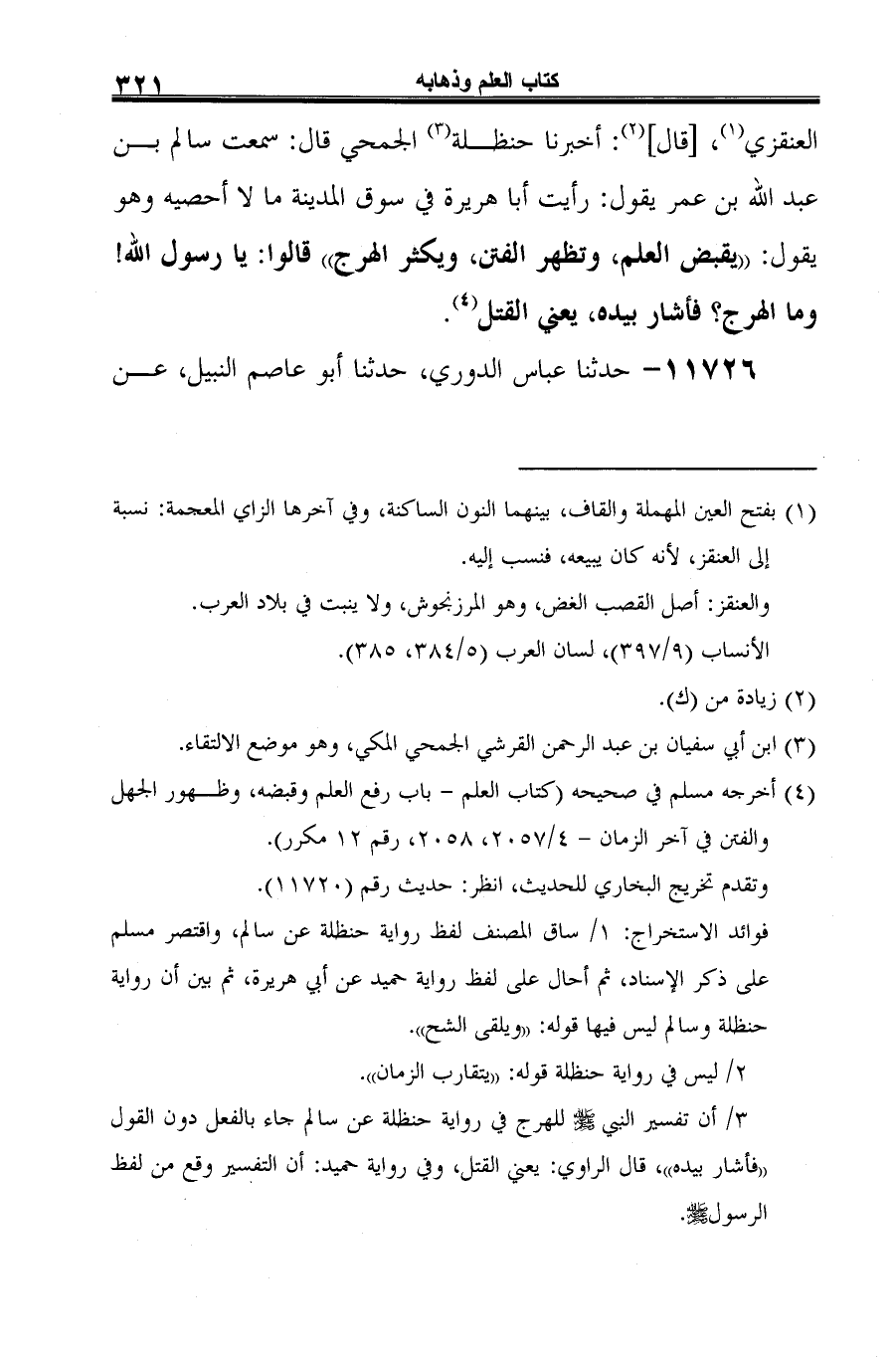 -[322]- حنظلة (¬1)، قال: سمعت سالمًا يقول: سمعت أبا هريرة يقول: قال رسول الله -صلى الله عليه وسلم-: "يقبض العلم، وتظهر الفتن، ويكثر الهرج"، قالوا: يا رسول الله! وما الهرج؟ فقال بيده هكذا (¬2).