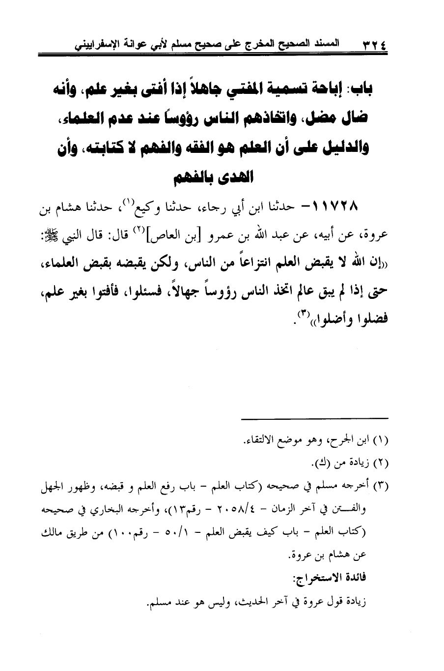 (¬3) أخرجه مسلم في صحيحه (كتاب العلم -باب رفع العلم وقبضه، وظهور الجهل والفتن في آخر الزمان -4/ 2058 - رقم 13)، وأخرجه البخاري في صحيحه (كتاب العلم -باب كيف يقبض العلم - 1/ 50 - رقم 100) من طريق مالك عن هشام بن عروة.