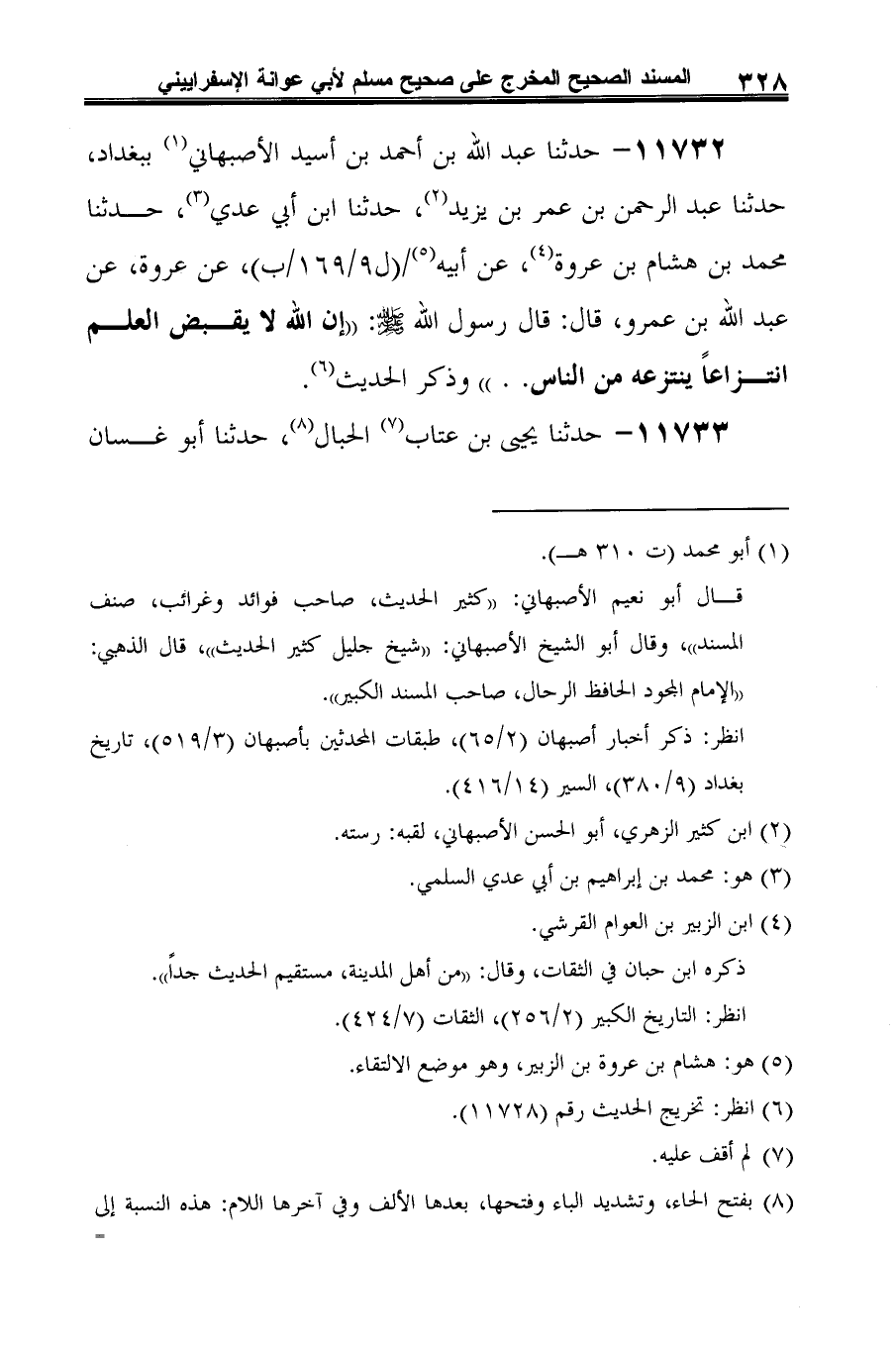 11732 - حدثنا عبد الله بن أحمد بن أسيد الأصبهاني (¬1) ببغداد، حدثنا عبد الرحمن بن عمر بن يزيد (¬2)، حدثنا ابن أبي عدي (¬3)، حدثنا محمد بن هشام بن عروة (¬4)، عن أبيه (¬5)، عن عروة، عن عبد الله بن عمرو، قال: قال رسول الله صلى الله عليه وسلم: "إن الله لا يقبض العلم انتزاعًا ينتزعه من الناس .. " وذكر الحديث (¬6)