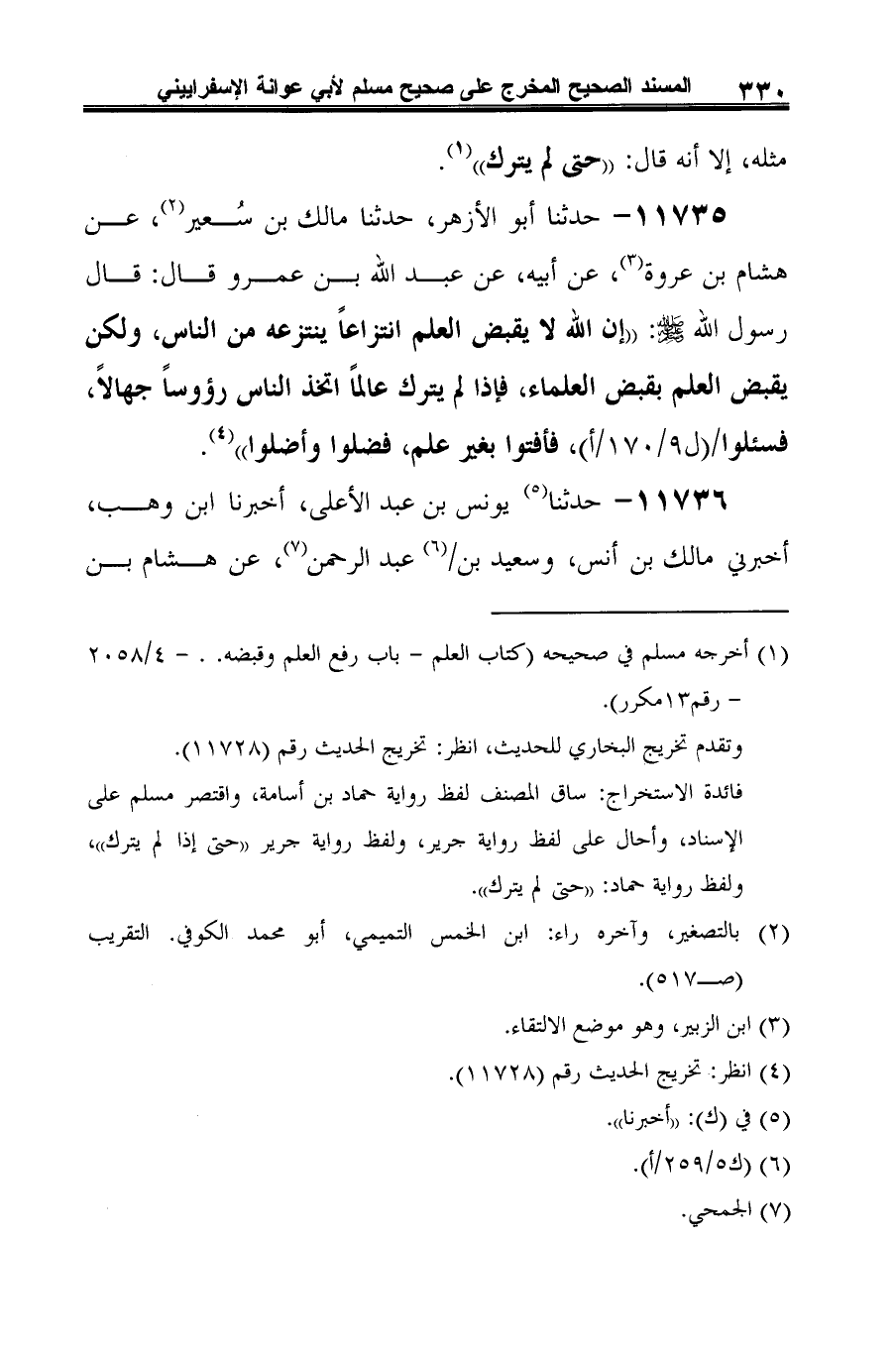 11735 - حدثنا أبو الأزهر، حدثنا مالك بن سُعير (¬1)، عن هشام بن عروة (¬2)، عن أبيه، عن عبد الله بن عمرو قال: قال رسول الله صلى الله عليه وسلم: "إن الله لا يقبض العلم انتزاعًا ينتزعه من الناس، ولكن يقبض العلم بقبض العلماء، فإذا لم يترك عالمًا اتخذ الناس رؤوسًا جهالًا، فسئلوا، فأفتوا بغير علم، فضلوا وأضلوا" (¬3).