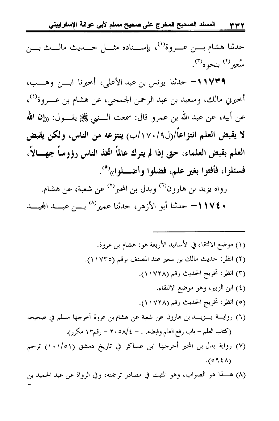11739 - حدثنا يونس بن عبد الأعلى، أخبرنا ابن وهب، أخبرني مالك، وسعيد بن عبد الرحمن الجمحي، عن هشام بن عروة (¬1)، عن أبيه، عن عبد الله بن عمرو قال: سمعت النبي صلى الله عليه وسلم يقول: "إن الله لا يقبض العلم انتزاعًا ينتزعه من الناس، ولكن يقبض العلم بقبض العلماء، حتى إذا لم يترك عالمًا اتخذ الناس رؤوسًا جهالًا، فسئلوا، فأفتوا بغير علم، فضلوا وأضلوا" (¬2).
