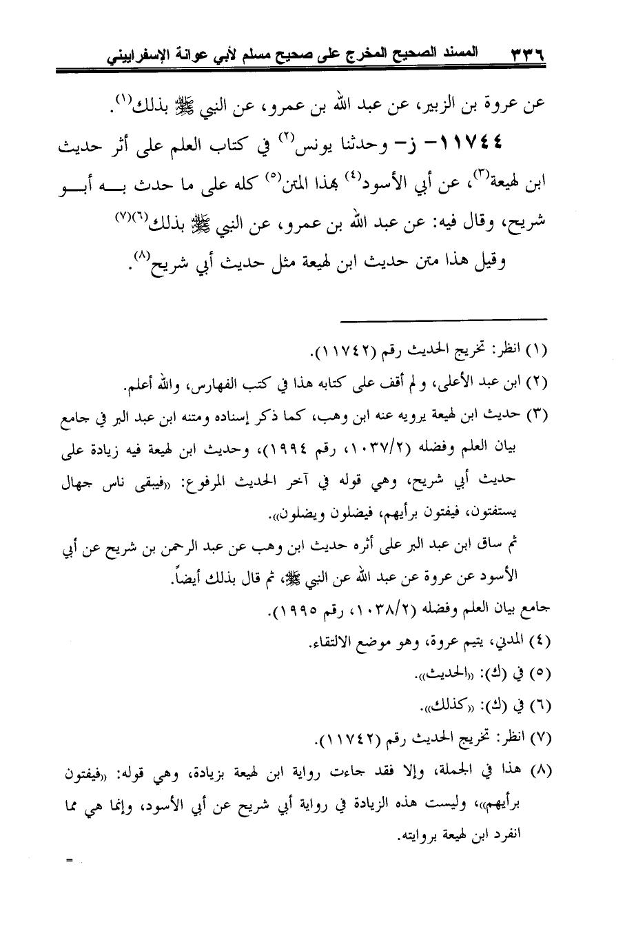 11744 - ز - وحدثنا يونس (¬1) في كتاب العلم على أثر حديث ابن لهيعة (¬2)، عن أبي الأسود (¬3) بهذا المتن (¬4) كله على ما حدث به أبو شريح، وقال فيه: عن عبد الله بن عمرو، عن النبي صلى الله عليه وسلم بذلك (¬5) (¬6).