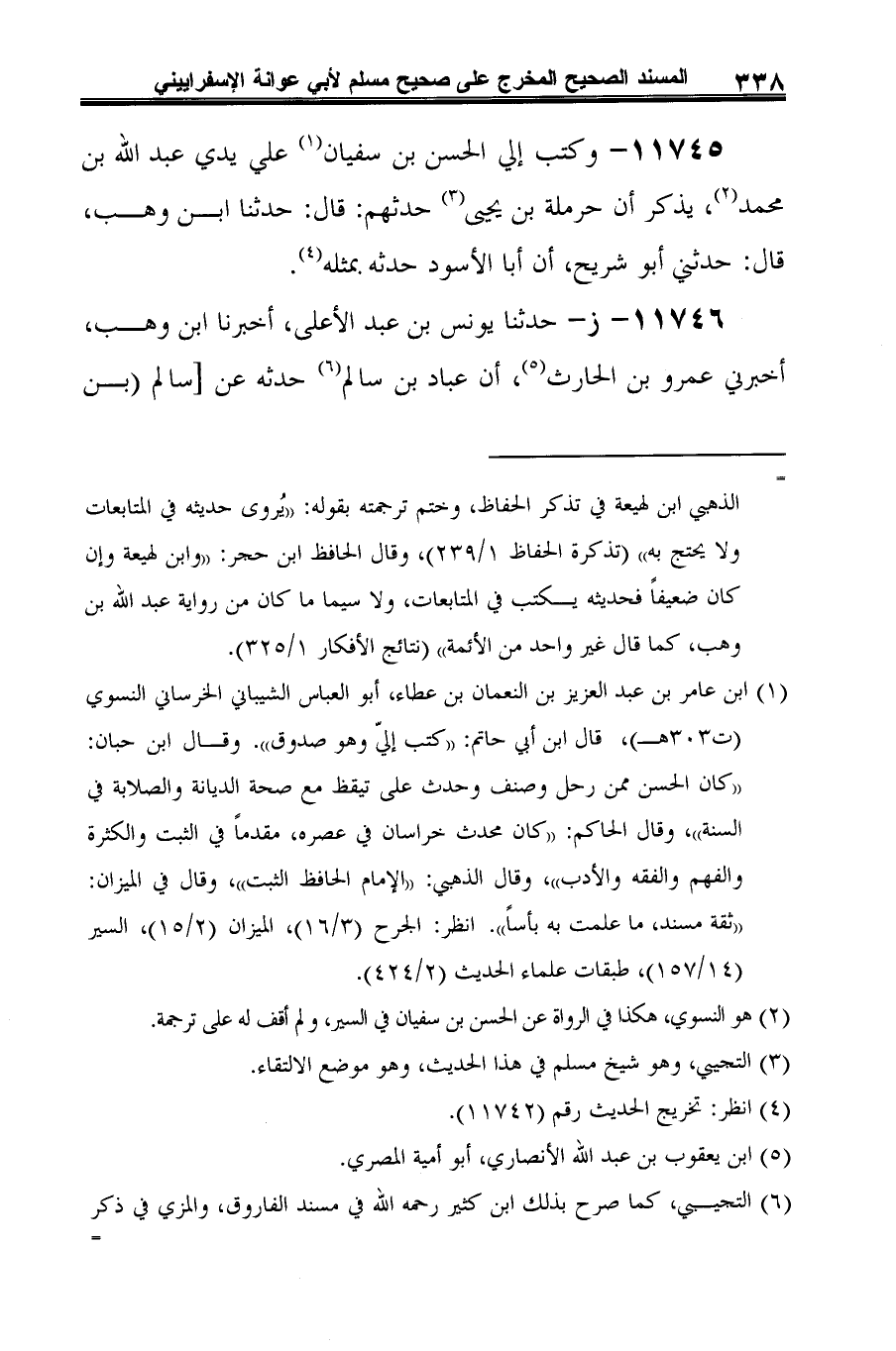 11745 - وكتب إلي الحسن بن سفيان (¬1) علي يدي عبد الله بن محمد (¬2)، يذكر أن حرملة بن يحيى (¬3) حدثهم: قال: حدثنا ابن وهب، قال: حدثني أبو شريح، أن أبا الأسود حدثه بمثله (¬4).