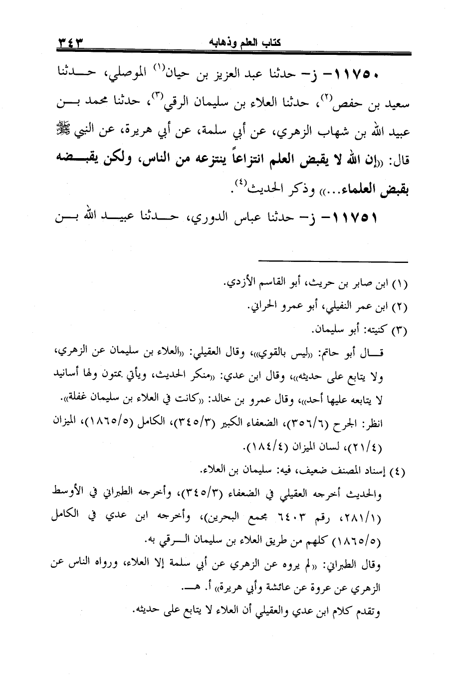 11750 - ز - حدثنا عبد العزيز بن حيان (¬1) الموصلي، حدثنا سعيد بن حفص (¬2)، حدثنا العلاء بن سليمان الرقي (¬3)، حدثنا محمد بن عبيد الله بن شهاب الزهري، عن أبي سلمة، عن أبي هريرة، عن النبي صلى الله عليه وسلم قال: "إن الله لا يقبض العلم انتزاعًا ينتزعه من الناس، ولكن يقبضه بقبض العلماء ... " وذكر الحديث (¬4).