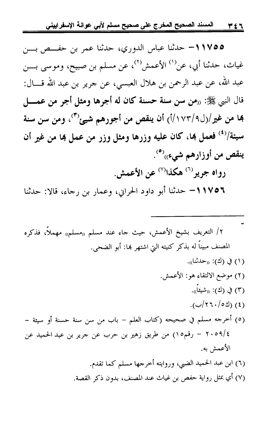 (¬5) أخرجه مسلم في صحيحه (كتاب العلم -باب من سن سنة حسنة أو سيئة- 4/ 2059 - رقم 15) من طريق زهير بن حرب عن جرير بن عبد الحميد عن الأعمش به.