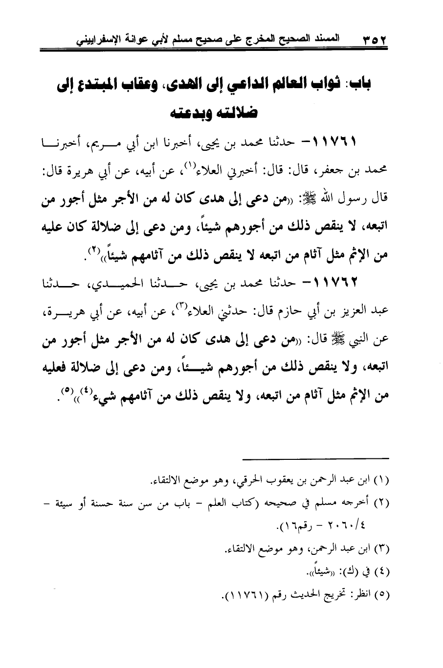 11762 - حدثنا محمد بن يحيى، حدثنا الحميدي، حدثنا عبد العزيز بن أبي حازم قال: حدثني العلاء (¬1)، عن أبيه، عن أبي هريرة، عن النبي صلى الله عليه وسلم قال: "من دعى إلى هدى كان له من الأجر مثل أجور من اتبعه، ولا ينقص ذلك من أجورهم شيئًا، ومن دعى إلى ضلالة فعليه من الإثم مثل آثام من اتبعه، ولا ينقص ذلك من آثامهم شيء (¬2) " (¬3).