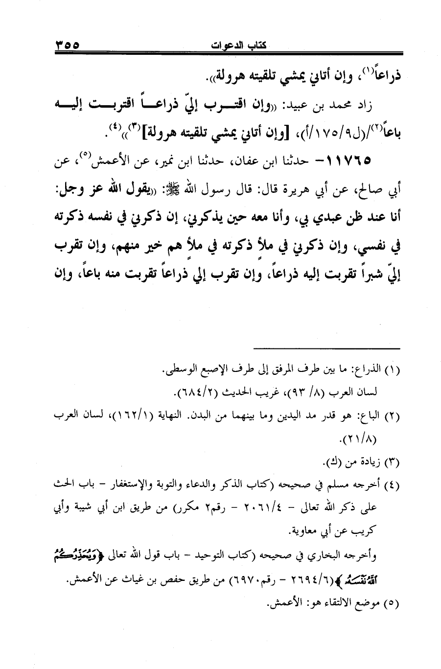 11765 - حدثنا ابن عفان، حدثنا ابن نمير، عن الأعمش (¬1)، عن أبي صالح، عن أبي هريرة قال: قال رسول الله صلى الله عليه وسلم: "يقول الله عز وجل: أنا عند ظن عبدي بي، وأنا معه حين يذكرني، إن ذكرني في نفسه ذكرته في نفسي، وإن ذكرني في ملأٍ ذكرته في ملأٍ هم خير منهم، وإن تقرب إليّ شبرًا تقربت إليه ذراعًا، وإن تقرب إلي ذراعًا تقربت منه باعًا، وإن