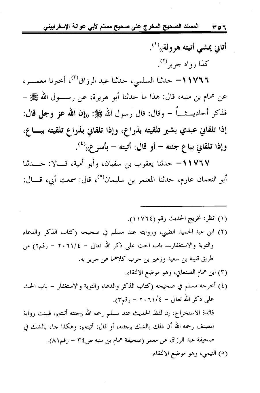 2/ ذكر الإمام مسلم أن رواية محمد بن عبد الأعلى عن المعتمر ليس فيها قوله عز وجل: "إذا أتاني يمشى أتيته هرولة"، وجاءت رواية المصنف من طريق أبي النعمان عارم عن المعتمر بإثبات قوله عز وجل في الحديث: "أتيته هرولة".