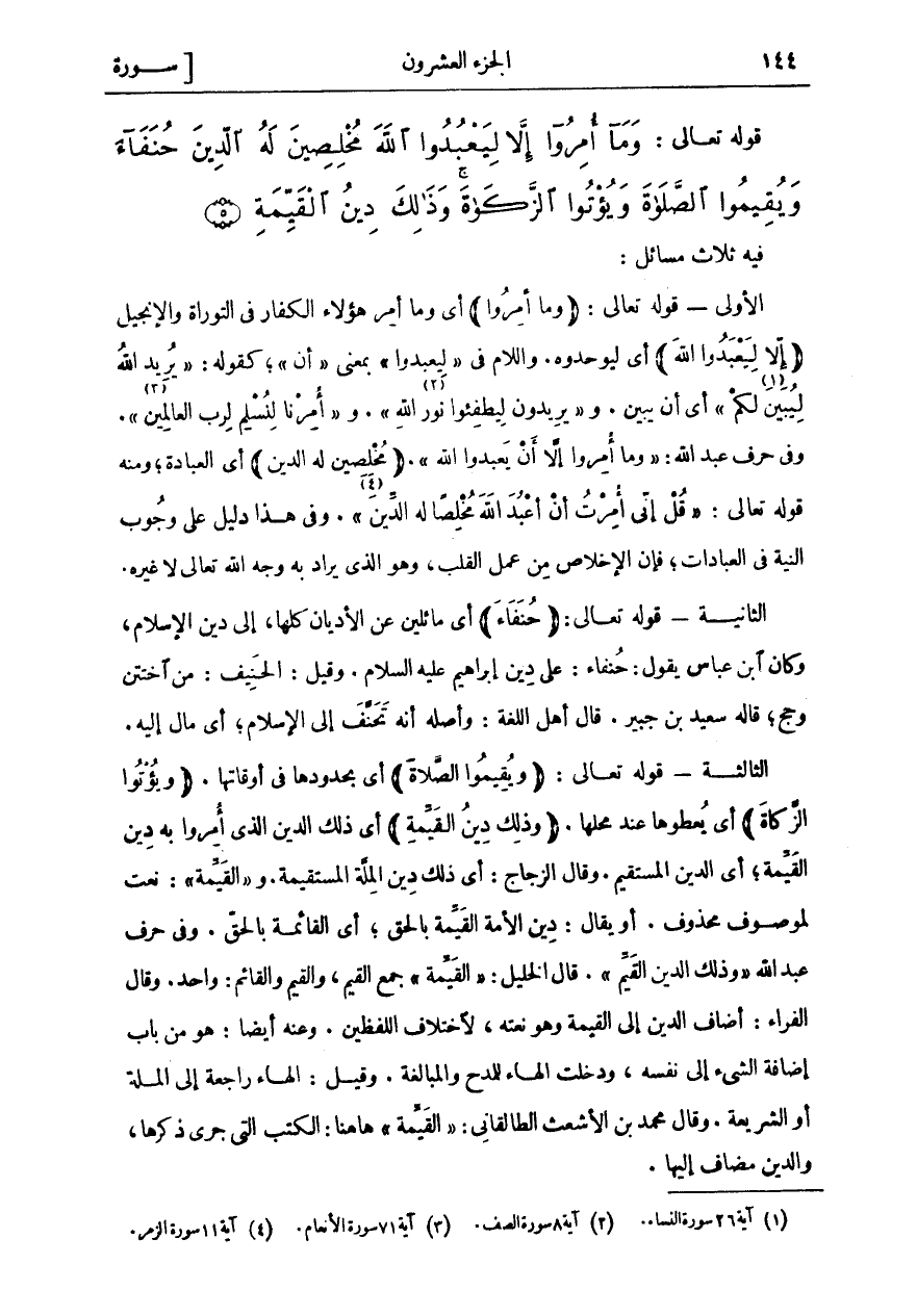 فِيهِ ثَلَاثُ مَسَائِلَ: الْأُولَى- قَوْلُهُ تَعَالَى: (وَما أُمِرُوا) أَيْ وَمَا أُمِرَ هَؤُلَاءِ الْكُفَّارُ فِي التَّوْرَاةِ وَالْإِنْجِيلِ (إِلَّا لِيَعْبُدُوا اللَّهَ) أَيْ لِيُوَحِّدُوهُ. وَاللَّامُ فِي لِيَعْبُدُوا بِمَعْنَى (أَنْ)، كقوله: يُرِيدُ اللَّهُ لِيُبَيِّنَ «١» لَكُمْ [النساء: ٢٦] أي أن يبين. ويُرِيدُونَ لِيُطْفِؤُا نُورَ اللَّهِ «٢» [الصف: ٨]. وأُمِرْنا لِنُسْلِمَ لِرَبِّ الْعالَمِينَ «٣» [الانعام: ٧١]. وَفِي حَرْفِ عَبْدِ اللَّهِ: وَمَا أُمِرُوا إِلَّا أَنْ يَعْبُدُوا اللَّهَ. (مُخْلِصِينَ لَهُ الدِّينَ) أَيِ الْعِبَادَةَ، وَمِنْهُ قَوْلُهُ تَعَالَى: قُلْ إِنِّي أُمِرْتُ أَنْ أَعْبُدَ اللَّهَ مُخْلِصاً لَهُ الدِّينَ «٤» [الزمر: ١١]. وَفِي هَذَا دَلِيلٌ عَلَى وُجُوبِ النِّيَّةِ فِي الْعِبَادَاتِ فَإِنَّ الْإِخْلَاصَ مِنْ عَمَلِ الْقَلْبِ وَهُوَ الَّذِي يُرَادُ بِهِ وَجْهُ اللَّهِ تَعَالَى لَا غَيْرِهِ. الثَّانِيَةُ- قَوْلُهُ تَعَالَى: (حُنَفاءَ) أَيْ مَائِلِينَ عَنِ الْأَدْيَانِ كُلِّهَا، إِلَى دِينِ الْإِسْلَامِ، وَكَانَ ابْنُ عَبَّاسٍ يَقُولُ: حُنَفَاءُ: عَلَى دِينِ إِبْرَاهِيمَ عَلَيْهِ السَّلَامُ. وَقِيلَ: الْحَنِيفُ: مَنِ اخْتَتَنَ وَحَجَّ، قَالَهُ سَعِيدُ بْنُ جُبَيْرٍ. قَالَ أَهْلُ اللُّغَةِ: وَأَصْلُهُ أَنَّهُ تَحَنَّفَ إِلَى الْإِسْلَامِ، أَيْ مَالَ إِلَيْهِ. الثَّالِثَةُ- قَوْلُهُ تَعَالَى: (وَيُقِيمُوا الصَّلاةَ) أَيْ بِحُدُودِهَا فِي أَوْقَاتِهَا. (وَيُؤْتُوا الزَّكاةَ) أَيْ يُعْطُوهَا عِنْدَ مَحَلِّهَا. (وَذلِكَ دِينُ الْقَيِّمَةِ) أَيْ ذَلِكَ الدين الذي أمروا به دين القيمة، أَيِ الدِّينُ الْمُسْتَقِيمُ. وَقَالَ الزَّجَّاجُ: أَيْ ذَلِكَ دِينُ الْمِلَّةِ الْمُسْتَقِيمَةِ. والْقَيِّمَةِ: نَعْتٌ لِمَوْصُوفٍ مَحْذُوفٍ. أَوْ يُقَالُ: دِينُ الْأُمَّةِ الْقَيِّمَةِ بِالْحَقِّ، أَيِ الْقَائِمَةِ بِالْحَقِّ. وَفِي حَرْفِ عَبْدِ اللَّهِ وَذَلِكَ الدِّينُ الْقَيِّمُ. قَالَ الْخَلِيلُ: الْقَيِّمَةِ جَمْعُ الْقَيِّمِ، وَالْقَيِّمُ وَالْقَائِمُ: وَاحِدٌ. وَقَالَ الْفَرَّاءُ: أَضَافَ الدِّينَ إِلَى الْقَيِّمَةِ وَهُوَ نَعْتُهُ، لِاخْتِلَافِ اللَّفْظَيْنِ. وَعَنْهُ أَيْضًا: هُوَ مِنْ بَابِ إِضَافَةِ الشَّيْءِ إِلَى نَفْسِهِ، وَدَخَلَتِ الْهَاءُ لِلْمَدْحِ وَالْمُبَالَغَةِ. وَقِيلَ: الْهَاءُ رَاجِعَةٌ إِلَى الْمِلَّةِ أَوِ الشَّرِيعَةِ. وَقَالَ مُحَمَّدُ بن الأشعث، الطالقاني الْقَيِّمَةِ ها هنا: الْكُتُبُ الَّتِي جَرَى ذِكْرُهَا، وَالدِّينُ مُضَافٌ إِلَيْهَا.
