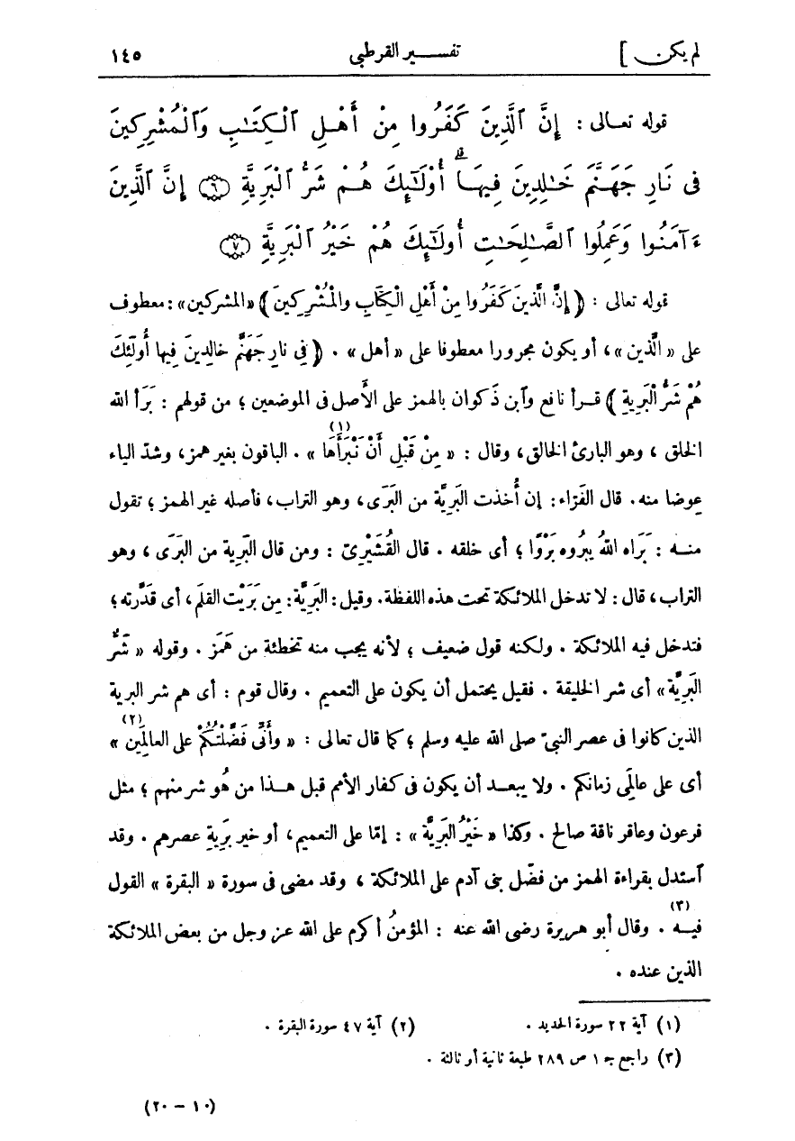 قَوْلُهُ تَعَالَى: (إِنَّ الَّذِينَ كَفَرُوا مِنْ أَهْلِ الْكِتابِ وَالْمُشْرِكِينَ) الْمُشْرِكِينَ: مَعْطُوفٌ عَلَى الَّذِينَ، أَوْ يَكُونُ مَجْرُورًا مَعْطُوفًا عَلَى أَهْلِ. (فِي نارِ جَهَنَّمَ خالِدِينَ فِيها أُولئِكَ هُمْ شَرُّ الْبَرِيَّةِ) قَرَأَ نَافِعٌ وَابْنُ ذَكْوَانَ بِالْهَمْزِ عَلَى الْأَصْلِ فِي الْمَوْضِعَيْنِ، مِنْ قَوْلِهِمْ: بَرَأَ اللَّهُ الْخَلْقَ، وَهُوَ الْبَارِئُ الْخَالِقُ، وقال: مِنْ قَبْلِ أَنْ نَبْرَأَها «١» [الحديد: ٢٢]. الْبَاقُونَ بِغَيْرِ هَمْزٍ، وَشَدَّ الْيَاءَ عِوَضًا مِنْهُ. قَالَ الْفَرَّاءُ: إِنْ أُخِذَتِ الْبَرِيَّةُ مِنَ الْبَرَى، وَهُوَ التُّرَابُ، فَأَصْلُهُ غَيْرُ الْهَمْزِ، تَقُولُ مِنْهُ: براه الله يبرؤه بَرْوًا، أَيْ خَلَقَهُ. قَالَ الْقُشَيْرِيُّ: وَمَنْ قَالَ الْبَرِيَّةُ مِنَ الْبَرَى، وَهُوَ التُّرَابُ، قَالَ: لَا تَدْخُلُ الْمَلَائِكَةُ تَحْتَ هَذِهِ اللَّفْظَةِ. وَقِيلَ: الْبَرِيَّةُ: مِنْ بَرَيْتُ الْقَلَمَ، أَيْ قَدَّرْتُهُ، فَتَدْخُلُ فِيهِ الْمَلَائِكَةُ. وَلَكِنَّهُ قَوْلٌ ضَعِيفٌ، لِأَنَّهُ يَجِبُ مِنْهُ تَخْطِئَةُ مَنْ هَمَزَ. وَقَوْلُهُ شَرُّ الْبَرِيَّةِ أَيْ شَرُّ الْخَلِيقَةِ. فَقِيلَ يَحْتَمِلُ أَنْ يَكُونَ عَلَى التَّعْمِيمِ. وَقَالَ قَوْمٌ: أَيْ هُمْ شَرُّ الْبَرِيَّةِ الَّذِينَ كَانُوا فِي عَصْرِ النَّبِيِّ صَلَّى اللَّهُ عَلَيْهِ وَسَلَّمَ، كَمَا قَالَ تَعَالَى: وَأَنِّي فَضَّلْتُكُمْ عَلَى الْعالَمِينَ «٢» [البقرة: ٤٧] أَيْ عَلَى عَالِمِي زَمَانِكُمْ. وَلَا يَبْعُدُ أَنْ يَكُونَ فِي كُفَّارِ الْأُمَمِ قَبْلَ هَذَا مَنْ هُوَ شَرٌّ مِنْهُمْ، مِثْلُ فِرْعَوْنَ وَعَاقِرِ نَاقَةِ صَالِحٍ. وَكَذَا خَيْرُ الْبَرِيَّةِ: إِمَّا عَلَى التَّعْمِيمِ، أَوْ خَيْرُ بَرِيَّةِ عَصْرِهِمْ. وَقَدِ اسْتَدَلَّ بِقِرَاءَةِ الْهَمْزِ مَنْ فَضَّلَ بَنِي آدَمَ عَلَى الْمَلَائِكَةِ، وَقَدْ مَضَى فِي سُورَةِ" الْبَقَرَةِ" الْقَوْلُ فِيهِ «٣». وَقَالَ أَبُو هُرَيْرَةَ رَضِيَ اللَّهُ عَنْهُ: الْمُؤْمِنُ أَكْرَمُ عَلَى اللَّهِ عَزَّ وَجَلَّ مِنْ بَعْضِ الملائكة الذين عنده.